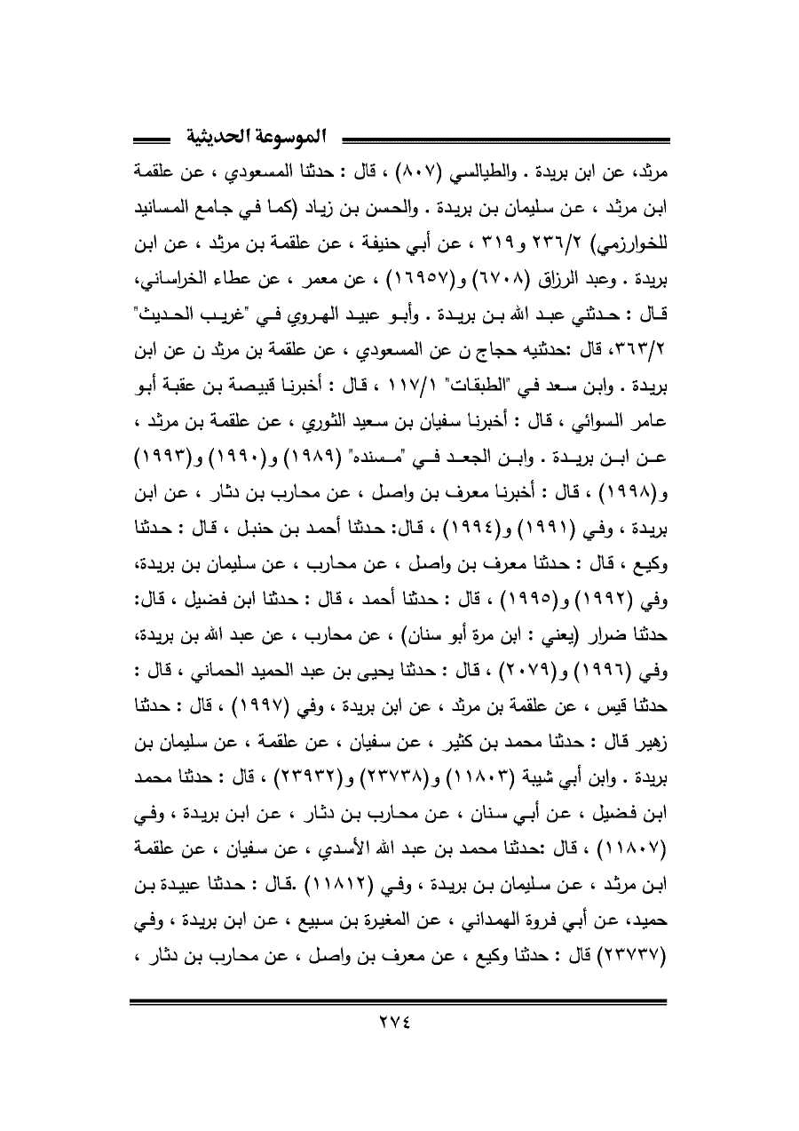 مرثد، عن ابن بريدة. والطيالسي (٨٠٧)، قال: حدثنا المسعودي، عن علقمة بن مرثد، عن سليمان بن بريدة. والحسن بن زياد (كما في جامع المسانيد للخوارزمي) ٢/ ٢٣٦ و ٣١٩، عن أبي حنيفة، عن علقمة بن مرثد، عن ابن بريدة. وعبد الرزاق (٦٧٠٨) و (١٦٩٥٧)، عن معمر، عن عطاء الخراساني، قال: حدثني عبد الله بن بريدة. وأبو عبيد الهروي في "غريب الحديث" ٢/ ٣٦٣، قال: حدثنيه حجاج، عن المسعودي، عن علقمة بن مرثدن عن ابن بريدة. وابن سعد في "الطبقات" ١/ ١١٧، قال: أخبرنا قبيصة بن عقبة أبو عامر السوائي، قال: أخبرنا سفيان بن سعيد الثوري، عن علقمة بن مرثد، عن ابن بريدة. وابن الجعد في "مسنده" (١٩٨٩) و (١٩٩٠) و (١٩٩٣) و (١٩٩٨)، قال: أخبرنا معرف بن واصل، عن محارب بن دثار، عن ابن بريدة، وفي (١٩٩١) و (١٩٩٤)، قال: حدثنا أحمد بن حنبل، قال: حدثنا وكيع، قال: حدثنا معرف بن واصل، عن محارب، عن سليمان بن بريدة، وفي (١٩٩٢) و (١٩٩٥)، قال: حدثنا أحمد، قال: حدثنا ابن فضيل، قال: حدثنا ضرار (يعني: ابن مرة أبو سنان)، عن محارب، عن عبد الله بن بريدة، وفي (١٩٩٦) و (٢٠٧٩)، قال: حدثنا يحيى بن عبد الحميد الحماني، قال: حدثنا قيس، عن علقمة بن مرثد، عن ابن بريدة، وفي (١٩٩٧)، قال: حدثنا زهير قال: حدثنا محمد بن كثير، عن سفيان، عن علقمة، عن سليمان بن بريدة. وابن أبي شيبة (١١٨٠٣) و (٢٣٧٣٨) و (٢٣٩٣٢)، قال: حدثنا محمد بن فضيل، عن أبي سنان، عن محارب بن دثار، عن ابن بريدة، وفي (١١٨٠٧)، قال: حدثنا محمد بن عبد الله الأسدي، عن سفيان، عن علقمة بن مرثد، عن سليمان بن بريدة، وفي (١١٨١٢). قال: حدثنا عبيدة بن حميد، عن أبي فروة الهمداني، عن المغيرة بن سبيع، عن ابن بريدة، وفي (٢٣٧٣٧) قال: حدثنا وكيع، عن معرف بن واصل، عن محارب بن دثار،