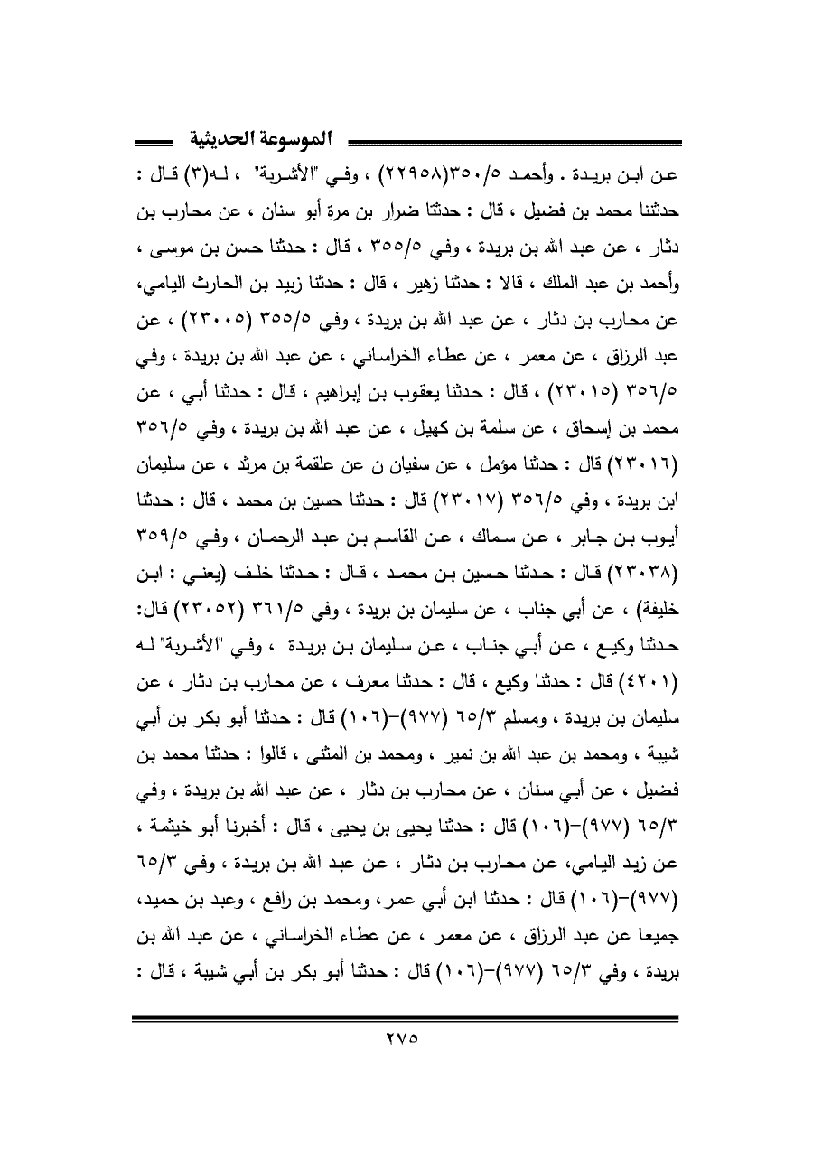 عن ابن بريدة. وأحمد ٥/ ٣٥٠ (٢٢٩٥٨)، وفي "الأشربة"، له (٣) قال: حدثننا محمد بن فضيل، قال: حدثنا ضرار بن مرة أبو سنان، عن محارب بن دثار، عن عبد الله بن بريدة، وفي ٥/ ٣٥٥، قال: حدثنا حسن بن موسى، وأحمد بن عبد الملك، قالا: حدثنا زهير، قال: حدثنا زبيد بن الحارث اليامي، عن محارب بن دثار، عن عبد الله بن بريدة، وفي ٥/ ٣٥٥ (٢٣٠٠٥)، عن عبد الرزاق، عن معمر، عن عطاء الخراساني، عن عبد الله بن بريدة، وفي ٥/ ٣٥٦ (٢٣٠١٥)، قال: حدثنا يعقوب بن إبراهيم، قال: حدثنا أبي، عن محمد بن إسحاق، عن سلمة بن كهيل، عن عبد الله بن بريدة، وفي ٥/ ٣٥٦ (٢٣٠١٦) قال: حدثنا مؤمل، عن سفيان ن عن علقمة بن مرثد، عن سليمان بن بريدة، وفي ٥/ ٣٥٦ (٢٣٠١٧) قال: حدثنا حسين بن محمد، قال: حدثنا أيوب بن جابر، عن سماك، عن القاسم بن عبد الرحمان، وفي ٥/ ٣٥٩ (٢٣٠٣٨) قال: حدثنا حسين بن محمد، قال: حدثنا خلف (يعني: ابن خليفة)، عن أبي جناب، عن سليمان بن بريدة، وفي ٥/ ٣٦١ (٢٣٠٥٢) قال: حدثنا وكيع، عن أبي جناب، عن سليمان بن بريدة، وفي "الأشربة" له (٤٢٠١) قال: حدثنا وكيع، قال: حدثنا معرف، عن محارب بن دثار، عن سليمان بن بريدة، ومسلم ٣/ ٦٥ (٩٧٧) - (١٠٦) قال: حدثنا أبو بكر بن أبي شيبة، ومحمد بن عبد الله بن نمير، ومحمد بن المثنى، قالوا: حدثنا محمد بن فضيل، عن أبي سنان، عن محارب بن دثار، عن عبد الله بن بريدة، وفي ٣/ ٦٥ (٩٧٧) - (١٠٦) قال: حدثنا يحيى بن يحيى، قال: أخبرنا أبو خيثمة، عن زيد اليامي، عن محارب بن دثار، عن عبد الله بن بريدة، وفي ٣/ ٦٥ (٩٧٧) - (١٠٦) قال: حدثنا ابن أبي عمر، ومحمد بن رافع، وعبد بن حميد، جميعا عن عبد الرزاق، عن معمر، عن عطاء الخراساني، عن عبد الله بن بريدة، وفي ٣/ ٦٥ (٩٧٧) - (١٠٦) قال: حدثنا أبو بكر بن أبي شيبة، قال: