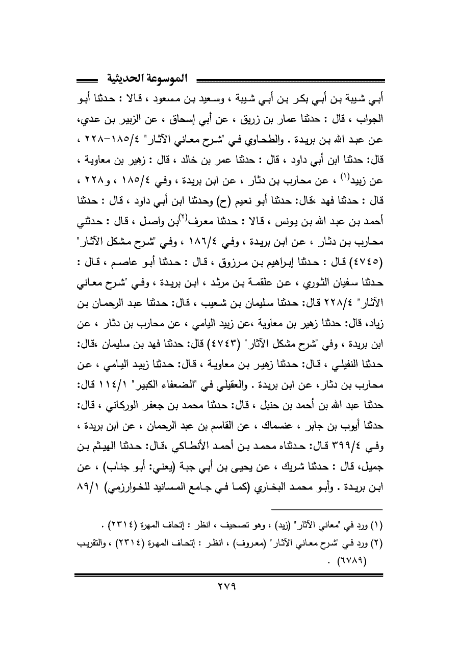 أبي شيبة بن أبي بكر بن أبي شيبة، وسعيد بن مسعود، قالا: حدثنا أبو الجواب، قال: حدثنا عمار بن زريق، عن أبي إسحاق، عن الزبير بن عدي، عن عبد الله بن بريدة. والطحاوي في "شرح معاني الآثار" ٤/ ١٨٥ - ٢٢٨، قال: حدثنا ابن أبي داود، قال: حدثنا عمر بن خالد، قال: زهير بن معاوية، عن زبيد (¬١)، عن محارب بن دثار، عن ابن بريدة، وفي ٤/ ١٨٥، و ٢٢٨، قال: حدثنا فهد، قال: حدثنا أبو نعيم (ح) وحدثنا ابن أبي داود، قال: حدثنا أحمد بن عبد الله بن يونس، قالا: حدثنا معرف (¬٢) بن واصل، قال: حدثني محارب بن دثار، عن ابن بريدة، وفي ٤/ ١٨٦، وفي "شرح مشكل الآثار" (٤٧٤٥) قال: حدثنا إبراهيم بن مرزوق، قال: حدثنا أبو عاصم، قال: حدثنا سفيان الثوري، عن علقمة بن مرثد، ابن بريدة، وفي "شرح معاني الآثار" ٤/ ٢٢٨ قال: حدثنا سليمان بن شعيب، قال: حدثنا عبد الرحمان بن زياد، قال: حدثنا زهير بن معاوية، عن زبيد اليامي، عن محارب بن دثار، عن ابن بريدة، وفي "شرح مشكل الآثار" (٤٧٤٣) قال: حدثنا فهد بن سليمان، قال: حدثنا النفيلي، قال: حدثنا زهير بن معاوية، قال: حدثنا زبيد اليامي، عن محارب بن دثار، عن ابن بريدة. والعقيلي في "الضعفاء الكبير" ١/ ١١٤ قال: حدثنا عبد الله بن أحمد بن حنبل، قال: حدثنا محمد بن جعفر الوركاني، قال: حدثنا أيوب بن جابر، عن سماك، عن القاسم بن عبد الرحمان، عن ابن بريدة، وفي ٤/ ٣٩٩ قال: حدثناه محمد بن أحمد الأنطاكي، قال: حدثنا الهيثم بن جميل، قال: حدثنا شريك، عن يحيى بن أبي جبة (يعني: أبو جناب)، عن ابن بريدة. وأبو محمد البخاري (كما في جامع المسانيد للخوارزمي) ١/ ٨٩