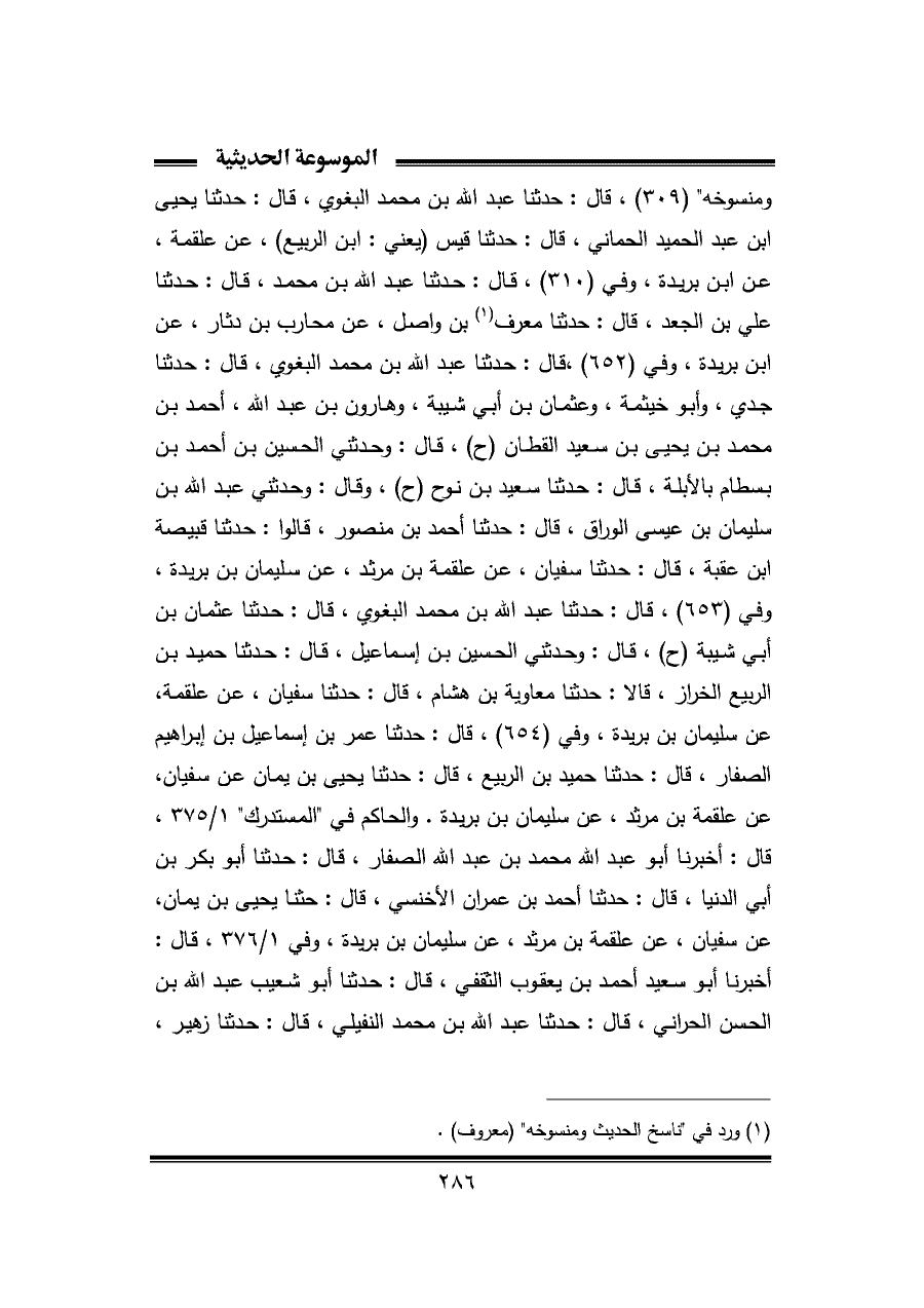 ومنسوخه" (٣٠٩)، قال: حدثنا عبد الله بن محمد البغوي، قال: حدثنا يحيى بن عبد الحميد الحماني، قال: حدثنا قيس (يعني: ابن الربيع)، عن علقمة، عن ابن بريدة، وفي (٣١٠)، قال: حدثنا عبد الله بن محمد، قال: حدثنا علي بن الجعد، قال: حدثنا معرف (¬١) بن واصل، عن محارب بن دثار، عن ابن بريدة، وفي (٦٥٢)، قال: حدثنا عبد الله بن محمد البغوي، قال: حدثنا جدي، وأبو خيثمة، وعثمان بن أبي شيبة، وهارون بن عبد الله، أحمد بن محمد بن يحيى بن سعيد القطان (ح)، قال: وحدثني الحسين بن أحمد بن بسطام بالأبلة، قال: حدثنا سعيد بن نوح (ح)، وقال: وحدثني عبد الله بن سليمان بن عيسى الوراق، قال: حدثنا أحمد بن منصور، قالوا: حدثنا قبيصة بن عقبة، قال: حدثنا سفيان، عن علقمة بن مرثد، عن سليمان بن بريدة، وفي (٦٥٣)، قال: حدثنا عبد الله بن محمد البغوي، قال: حدثنا عثمان بن أبي شيبة (ح)، قال: وحدثني الحسين بن إسماعيل، قال: حدثنا حميد بن الربيع الخراز، قالا: حدثنا معاوية بن هشام، قال: حدثنا سفيان، عن علقمة، عن سليمان بن بريدة، وفي (٦٥٤)، قال: حدثنا عمر بن إسماعيل بن إبراهيم الصفار، قال: حدثنا حميد بن الربيع، قال: حدثنا يحيى بن يمان عن سفيان، عن علقمة بن مرثد، عن سليمان بن بريدة. والحاكم في "المستدرك" ١/ ٣٧٥، قال: أخبرنا أبو عبد الله محمد بن عبد الله الصفار، قال: حدثنا أبو بكر بن أبي الدنيا، قال: حدثنا أحمد بن عمران الأخنسي، قال: حثنا يحيى بن يمان، عن سفيان، عن علقمة بن مرثد، عن سليمان بن بريدة، وفي ١/ ٣٧٦، قال: أخبرنا أبو سعيد أحمد بن يعقوب الثقفي، قال: حدثنا أبو شعيب عبد الله بن الحسن الحراني، قال: حدثنا عبد الله بن محمد النفيلي، قال: حدثنا زهير،