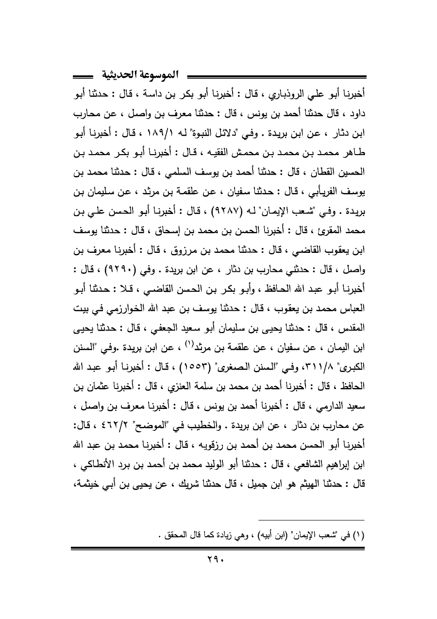 أخبرنا أبو علي الروذباري، قال: أخبرنا أبو بكر بن داسة، قال: حدثنا أبو داود، قال حدثنا أحمد بن يونس، قال: حدثنا معرف بن واصل، عن محارب بن دثار، عن ابن بريدة. وفي "دلائل النبوة" له ١/ ١٨٩، قال: أخبرنا أبو طاهر محمد بن محمد بن محمش الفقيه، قال: أخبرنا أبو بكر محمد بن الحسين القطان، قال: حدثنا أحمد بن يوسف السلمي، قال: حدثنا محمد بن يوسف الفريابي، قال: حدثنا سفيان، عن علقمة بن مرثد، عن سليمان بن بريدة. وفي "شعب الإيمان" له (٩٢٨٧)، قال: أخبرنا أبو الحسن علي بن محمد المقرئ، قال: أخبرنا الحسن بن محمد بن إسحاق، قال: حدثنا يوسف بن يعقوب القاضي، قال: حدثنا محمد بن مرزوق، قال: أخبرنا معرف بن واصل، قال: حدثني محارب بن دثار، عن ابن بريدة. وفي (٩٢٩٠)، قال: أخبرنا أبو عبد الله الحافظ، وأبو بكر بن الحسن القاضي، قلا: حدثنا أبو العباس محمد بن يعقوب، قال: حدثنا يوسف بن عبد الله الخوارزمي في بيت المقدس، قال: حدثنا يحيى بن سليمان أبو سعيد الجعفي، قال: حدثنا يحيى بن اليمان، عن سفيان، عن علقمة بن مرثد (¬١)، عن ابن بريدة. وفي "السنن الكبرى" ٨/ ٣١١، وفي "السنن الصغرى" (١٥٥٣)، قال: أخبرنا أبو عبد الله الحافظ، قال: أخبرنا أحمد بن محمد بن سلمة العنزي، قال: أخبرنا عثمان بن سعيد الدارمي، قال: أخبرنا أحمد بن يونس، قال: أخبرنا معرف بن واصل، عن محارب بن دثار، عن ابن بريدة. والخطيب في "الموضح" ٢/ ٤٦٢، قال: أخبرنا أبو الحسن محمد بن أحمد بن رزقويه، قال: أخبرنا محمد بن عبد الله بن إبراهيم الشافعي، قال: حدثنا أبو الوليد محمد بن أحمد بن برد الأنطاكي، قال: حدثنا الهيثم هو ابن جميل، قال حدثنا شريك، عن يحيى بن أبي خيثمة،