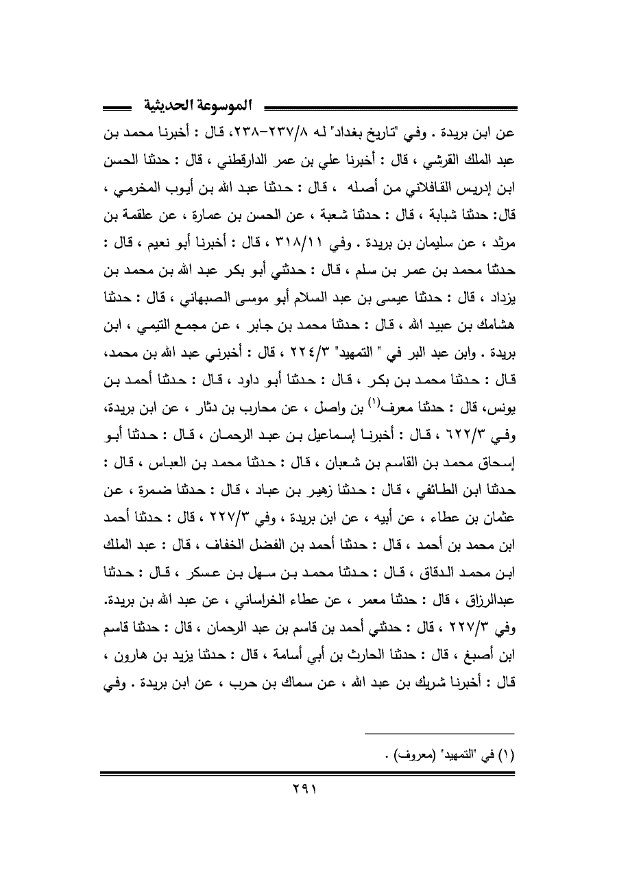 عن ابن بريدة. وفي "تاريخ بغداد" له ٨/ ٢٣٧ - ٢٣٨، قال: أخبرنا محمد بن عبد الملك القرشي، قال: أخبرنا علي بن عمر الدارقطني، قال: حدثنا الحسن بن إدريس القافلاني من أصله، قال: حدثنا عبد الله بن أيوب المخرمي، قال: حدثنا شبابة، قال: حدثنا شعبة، عن الحسن بن عمارة، عن علقمة بن مرثد، عن سليمان بن بريدة. وفي ١١/ ٣١٨، قال: أخبرنا أبو نعيم، قال: حدثنا محمد بن عمر بن سلم، قال: حدثني أبو بكر عبد الله بن محمد بن يزداد، قال: حدثنا عيسى بن عبد السلام أبو موسى الصبهاني، قال: حدثنا هشامك بن عبيد الله، قال: حدثنا محمد بن جابر، عن مجمع التيمي، ابن بريدة. وابن عبد البر في "التمهيد" ٣/ ٢٢٤، قال: أخبرني عبد الله بن محمد، قال: حدثنا محمد بن بكر، قال: حدثنا أبو داود، قال: حدثنا أحمد بن يونس، قال: حدثنا معرف (¬١) بن واصل، عن محارب بن دثار، عن ابن بريدة، وفي ٣/ ٦٢٢، قال: أخبرنا إسماعيل بن عبد الرحمان، قال: حدثنا أبو إسحاق محمد بن القاسم بن شعبان، قال: حدثنا محمد بن العباس، قال: حدثنا ابن الطائفي، قال: حدثنا زهير بن عباد، قال: حدثنا ضمرة، عن عثمان بن عطاء، عن أبيه، عن ابن بريدة، وفي ٣/ ٢٢٧، قال: حدثنا أحمد بن محمد بن أحمد، قال: حدثنا أحمد بن الفضل الخفاف، قال: عبد الملك بن محمد الدقاق، قال: حدثنا محمد بن سهل بن عسكر، قال: حدثنا عبد الرزاق، قال: حدثنا معمر، عن عطاء الخراساني، عن عبد الله بن بريدة. وفي ٣/ ٢٢٧، قال: حدثني أحمد بن قاسم بن عبد الرحمان، قال: حدثنا قاسم بن أصبغ، قال: حدثنا الحارث بن أبي أسامة، قال: حدثنا يزيد بن هارون، قال: أخبرنا شريك بن عبد الله، عن سماك بن حرب، عن ابن بريدة. وفي