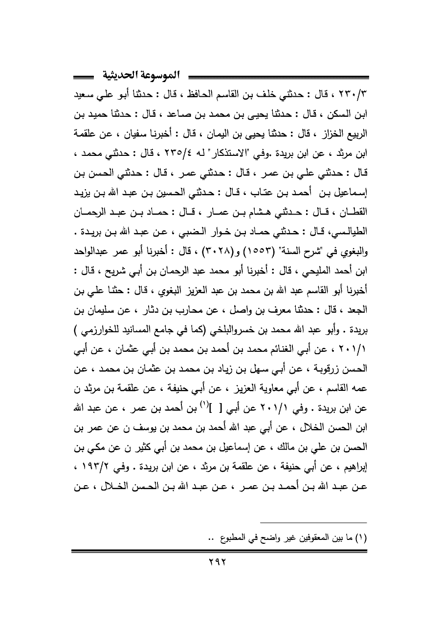 ٣/ -٢٣٠، قال: حدثني خلف بن القاسم الحافظ، قال: حدثنا أبو علي سعيد بن السكن، قال: حدثنا يحيى بن محمد بن صاعد، قال: حدثنا حميد بن الربيع الخزاز، قال: حدثنا يحيى بن اليمان، قال: أخبرنا سفيان، عن علقمة بن مرثد، عن ابن بريدة. وفي "الاستذكار" له ٤/ ٢٣٥، قال: حدثني محمد، قال: حدثني علي بن عمر، قال: حدثني عمر، قال: حدثني الحسن بن إسماعيل بن أحمد بن عتاب، قال: حدثني الحسين بن عبد الله بن يزيد القطان، قال: حدثني هشام بن عمار، قال: حماد بن عبد الرحمان الطيالسي، قال: حدثني حماد بن خوار الضبي، عن عبد الله بن بريدة. والبغوي في "شرح السنة" (١٥٥٣) و (٣٠٢٨)، قال: أخبرنا أبو عمر عبد الواحد بن أحمد المليحي، قال: أخبرنا أبو محمد عبد الرحمان بن أبي شريح، قال: أخبرنا أبو القاسم عبد الله بن محمد بن عبد العزيز البغوي، قال: حثنا علي بن الجعد، قال: حدثنا معرف بن واصل، عن محارب بن دثار، عن سليمان بن بريدة. وأبو عبد الله محمد بن خسرو البلخي (كما في جامع المسانيد للخوارزمي) ١/ ٢٠١، عن أبي الغنائم محمد بن أحمد بن محمد بن أبي عثمان، عن أبي الحسن زرقوية، عن أبي سهل بن زياد بن محمد بن عثمان بن محمد، عن عمه القاسم، عن أبي معاوية العزيز، عن أبي حنيفة، عن علقمة بن مرثدن عن ابن بريدة. وفي ١/ ٢٠١ عن أبي [] (¬١) بن أحمد بن عمر، عن عبد الله بن الحسن الخلال، عن أبي عبد الله أحمد بن محمد بن يوسف، عن عمر بن الحسن بن علي بن مالك، عن إسماعيل بن محمد بن أبي كثير، عن مكي بن إبراهيم، عن أبي حنيفة، عن علقمة بن مرثد، عن ابن بريدة. وفي ٢/ ١٩٣، عن عبد الله بن أحمد بن عمر، عن عبد الله بن الحسن الخلال، عن