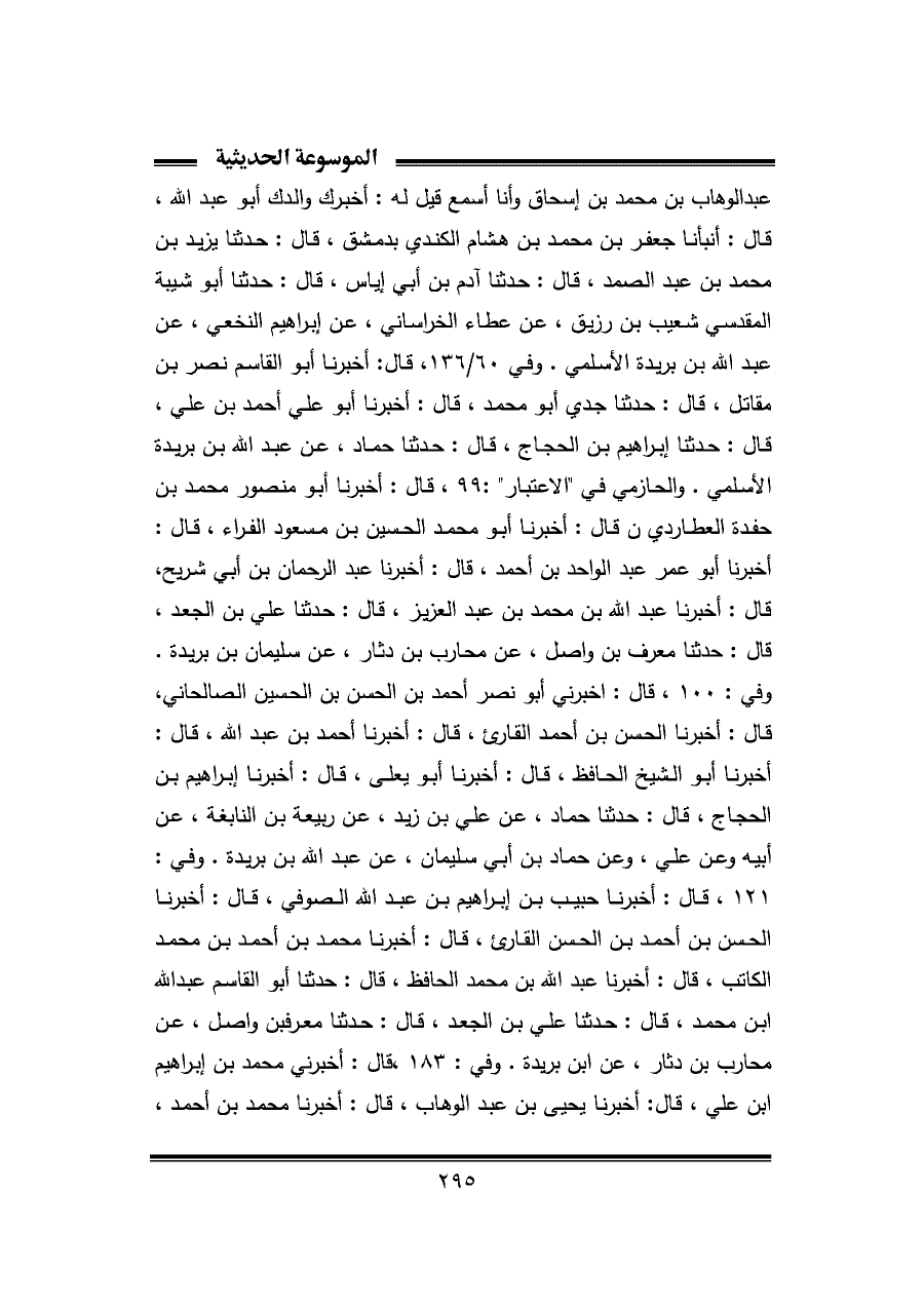 عبد الوهاب بن محمد بن إسحاق وأنا أسمع قيل له: أخبرك والدك أبو عبد الله، قال: أنبأنا جعفر بن محمد بن هشام الكندي بدمشق، قال: حدثنا يزيد بن محمد بن عبد الصمد، قال: حدثنا آدم بن أبي إياس، قال: حدثنا أبو شيبة المقدسي شعيب بن رزيق، عن عطاء الخراساني، عن إبراهيم النخعي، عن عبد الله بن بريدة الأسلمي. وفي ٦٠/ ١٣٦، قال: أخبرنا أبو القاسم نصر بن مقاتل، قال: حدثنا جدي أبو محمد، قال: أخبرنا أبو علي أحمد بن علي، قال: حدثنا إبراهيم بن الحجاج، قال: حدثنا حماد، عن عبد الله بن بريدة الأسلمي. والحازمي في "الاعتبار": ٩٩، قال: أخبرنا أبو منصور محمد بن حفدة العطاردي، قال: أخبرنا أبو محمد الحسين بن مسعود الفراء، قال: أخبرنا أبو عمر عبد الواحد بن أحمد، قال: أخبرنا عبد الرحمان بن أبي شريح، قال: أخبرنا عبد الله بن محمد بن عبد العزيز، قال: حدثنا علي بن الجعد، قال: حدثنا معرف بن واصل، عن محارب بن دثار، عن سليمان بن بريدة. وفي: ١٠٠، قال: أخبرني أبو نصر أحمد بن الحسن بن الحسين الصالحاني، قال: أخبرنا الحسن بن أحمد القارئ، قال: أخبرنا أحمد بن عبد الله، قال: أخبرنا أبو الشيخ الحافظ، قال: أخبرنا أبو يعلى، قال: أخبرنا إبراهيم بن الحجاج، قال: حدثنا حماد، عن علي بن زيد، عن ربيعة بن النابغة، عن أبيه وعن علي، وعن حماد بن أبي سليمان، عن عبد الله بن بريدة. وفي: ١٢١، قال: أخبرنا حبيب بن إبراهيم بن عبد الله الصوفي، قال: أخبرنا الحسن بن أحمد بن الحسن القارئ، قال: أخبرنا محمد بن أحمد بن محمد الكاتب، قال: أخبرنا عبد الله بن محمد الحافظ، قال: حدثنا أبو القاسم عبد الله بن محمد، قال: حدثنا علي بن الجعد، قال: حدثنا معرف بن واصل، عن محارب بن دثار، عن ابن بريدة. وفي: ١٨٣، قال: أخبرني محمد بن إبراهيم بن علي، قال: أخبرنا يحيى بن عبد الوهاب، قال: أخبرنا محمد بن أحمد،