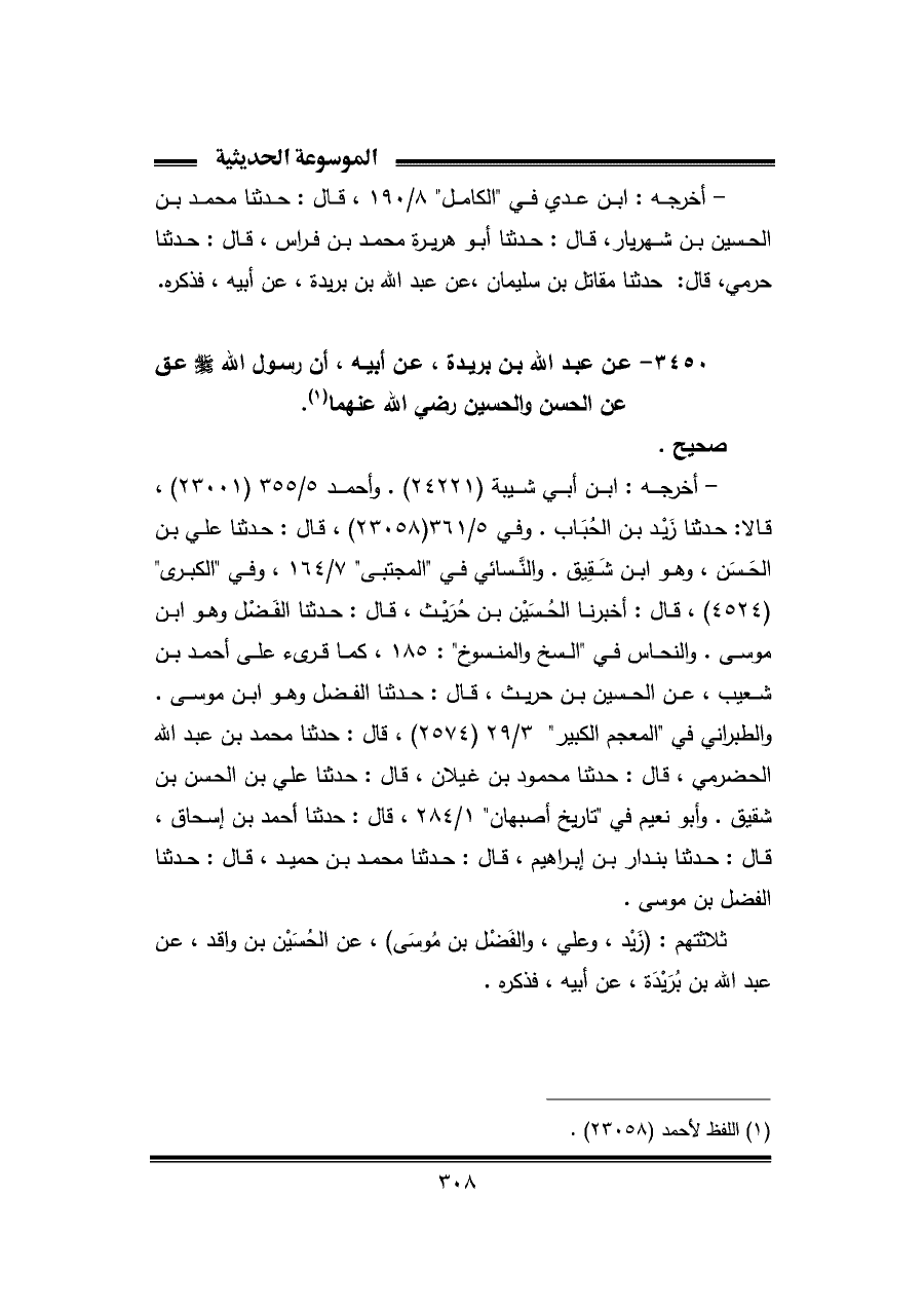 ٣٤٥٠ - عن عبد الله بن بريدة، عن أبيه، أن رسول الله - صلى الله عليه وسلم - عق عن الحسن والحسين رضي الله عنهما (¬١).