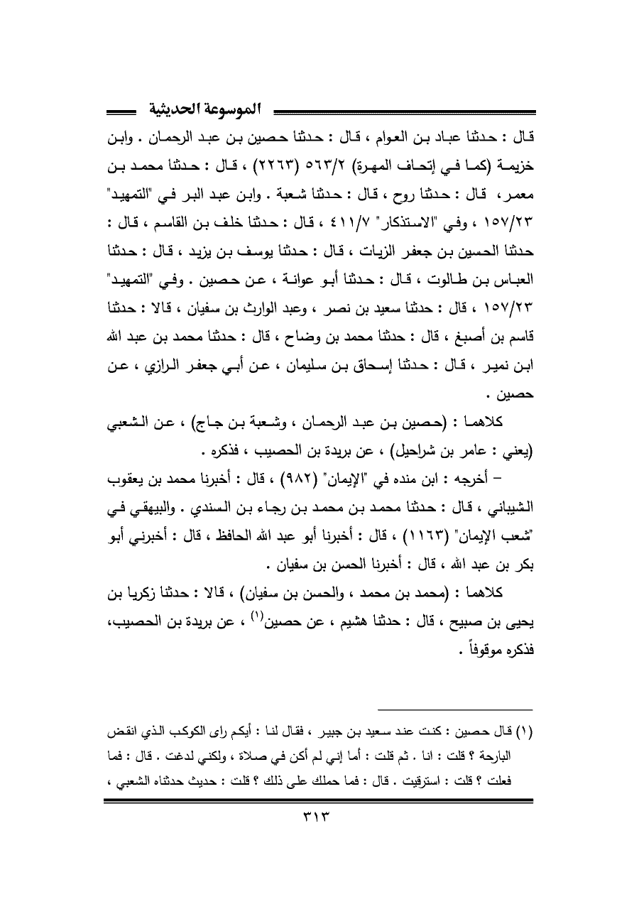 كلاهما: (محمد بن محمد، والحسن بن سفيان)، قالا: حدثنا زكريا بن يحيى بن صبيح، قال: حدثنا هشيم، عن حصين (¬١)، عن بريدة بن الحصيب، فذكره موقوفًا.