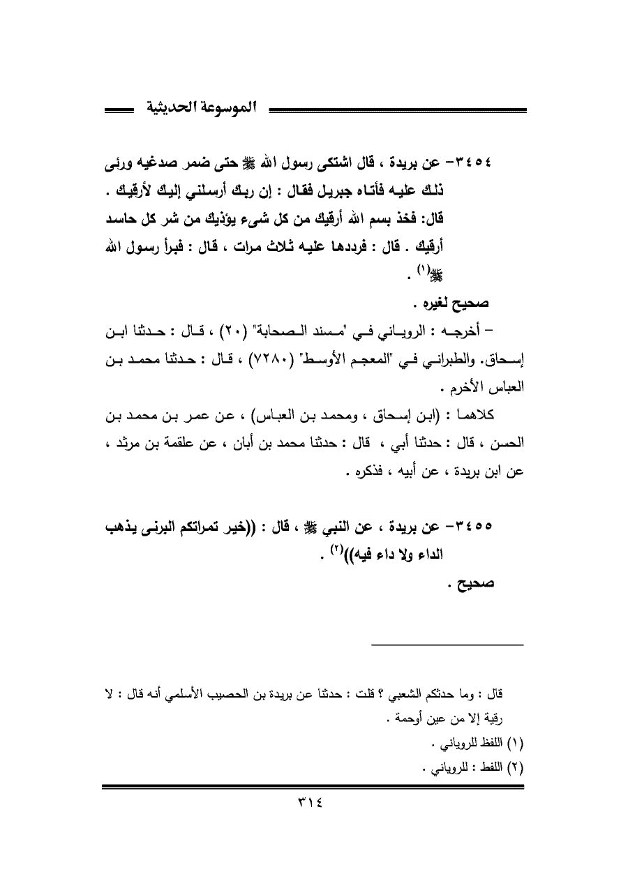 ٣٤٥٤ - عن بريدة، قال اشتكى رسول الله - صلى الله عليه وسلم - حتى ضمر صدغيه ورئى ذلك عليه فأتاه جبريل فقال: إن ربك أرسلني إليك لأرقيك. قال: فخذ بسم الله أرقيك من كل شئ يؤذيك من شر كل حاسد أرقيك. قال: فرددها عليه ثلاث مرات، قال: فبرأ رسول الله - صلى الله عليه وسلم - (¬١).