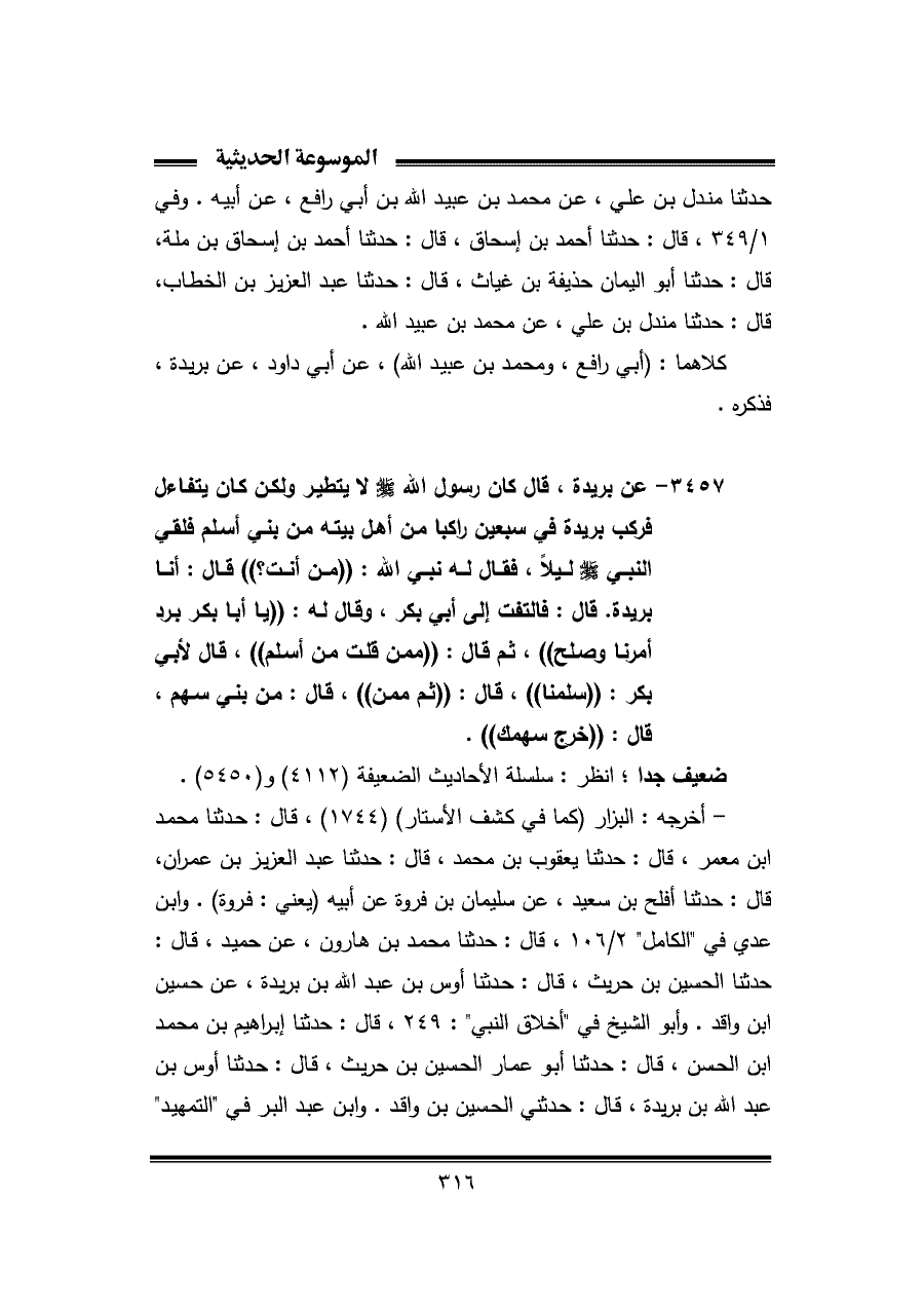 حدثنا مندل بن علي، عن محمد بن عبيد الله بن أبي رافع، عن أبيه. وفي ١/ ٣٤٩، قال: حدثنا أحمد بن إسحاق، قال: حدثنا أحمد بن إسحاق بن ملة، قال: حدثنا أبو اليمان حذيفة بن غياث، قال: حدثنا عبد العزيز بن الخطاب، قال: حدثنا مندل بن علي، عن محمد بن عبيد الله.