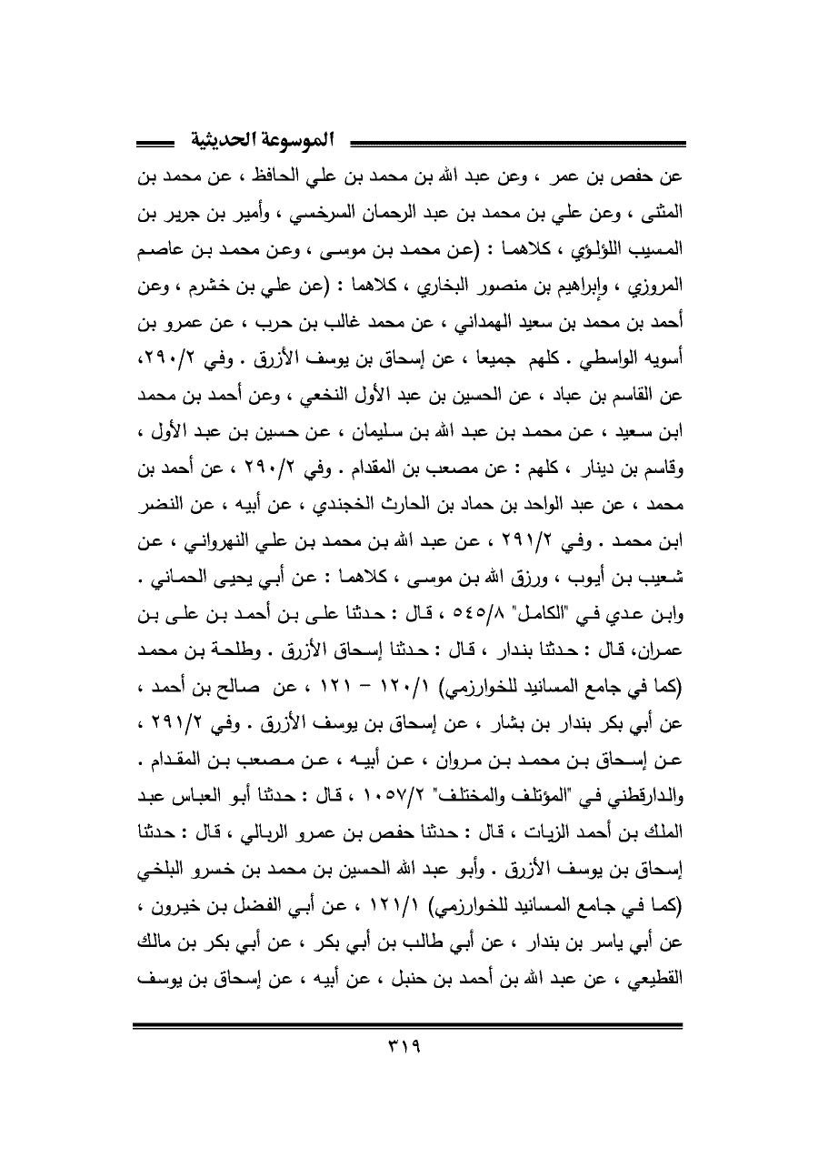 عن حفص بن عمر، وعن عبد الله بن محمد بن علي الحافظ، عن محمد بن المثنى، وعن علي بن محمد بن عبد الرحمان السرخسي، وأمير بن جرير بن المسيب اللؤلؤي، كلاهما: (عن محمد بن موسى، وعن محمد بن عاصم المروزي، وإبراهيم بن منصور البخاري، كلاهما: (عن علي بن خشرم، وعن أحمد بن محمد بن سعيد الهمداني، عن محمد غالب بن حرب، عن عمرو بن أسويه الواسطي. كلهم جميعا، عن إسحاق بن يوسف الأزرق. وفي ٢/ ٢٩٠، عن القاسم بن عباد، عن الحسين بن عبد الأول النخعي، وعن أحمد بن محمد بن سعيد، عن محمد بن عبد الله بن سليمان، عن حسين بن عبد الأول، وقاسم بن دينار، كلهم: عن مصعب بن المقدام. وفي ٢/ ٢٩٠، عن أحمد بن محمد، عن عبد الواحد بن حماد بن الحارث الخجندي، عن أبيه، عن النضر بن محمد. وفي ٢/ ٢٩١، عن عبد الله بن محمد بن علي النهرواني، عن شعيب بن أيوب، ورزق الله بن موسى، كلاهما: عن أبي يحيى الحماني. وابن عدي في "الكامل" ٨/ ٥٤٥، قال: حدثنا على بن أحمد بن على بن عمران، قال: حدثنا بندار، قال: حدثنا إسحاق الأزرق. وطلحة بن محمد (كما في جامع المسانيد للخوارزمي) ١/ ١٢٠ - ١٢١، عن صالح بن أحمد، عن أبي بكر بندار بن بشار، عن إسحاق بن يوسف الأزرق. وفي ٢/ ٢٩١، عن إسحاق بن محمد بن مروان، عن أبيه، عن مصعب بن المقدام. والدارقطني في "المؤتلف والمختلف" ٢/ ١٠٥٧، قال: حدثنا أبو العباس عبد الملك بن أحمد الزيات، قال: حدثنا حفص بن عمرو الربالي، قال: حدثنا إسحاق بن يوسف الأزرق. وأبو عبد الله الحسين بن محمد بن خسرو البلخي (كما في جامع المسانيد للخوارزمي) ١/ ١٢١، عن أبي الفضل بن خيرون، عن أبي ياسر بن بندار، عن أبي طالب بن أبي بكر، عن أبي بكر بن مالك القطيعي، عن عبد الله بن أحمد بن حنبل، عن أبيه، عن إسحاق بن يوسف