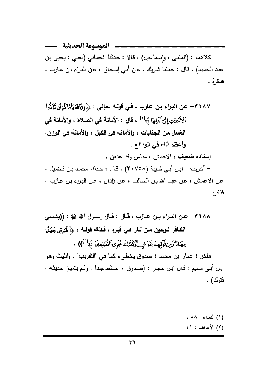 ٣٢٨٧ - عن البراء بن عازب، في قوله تعالى: {إِنَّ اللَّهَ يَأْمُرُكُمْ أَنْ تُؤَدُّوا الْأَمَانَاتِ إِلَى أَهْلِهَا} (¬١)، قال: الأمانة في الصلاة، والأمانة في الغسل من الجنابات، والأمانة في الكيل، والأمانة في الوزن، وأعظم ذلك في الودائع.