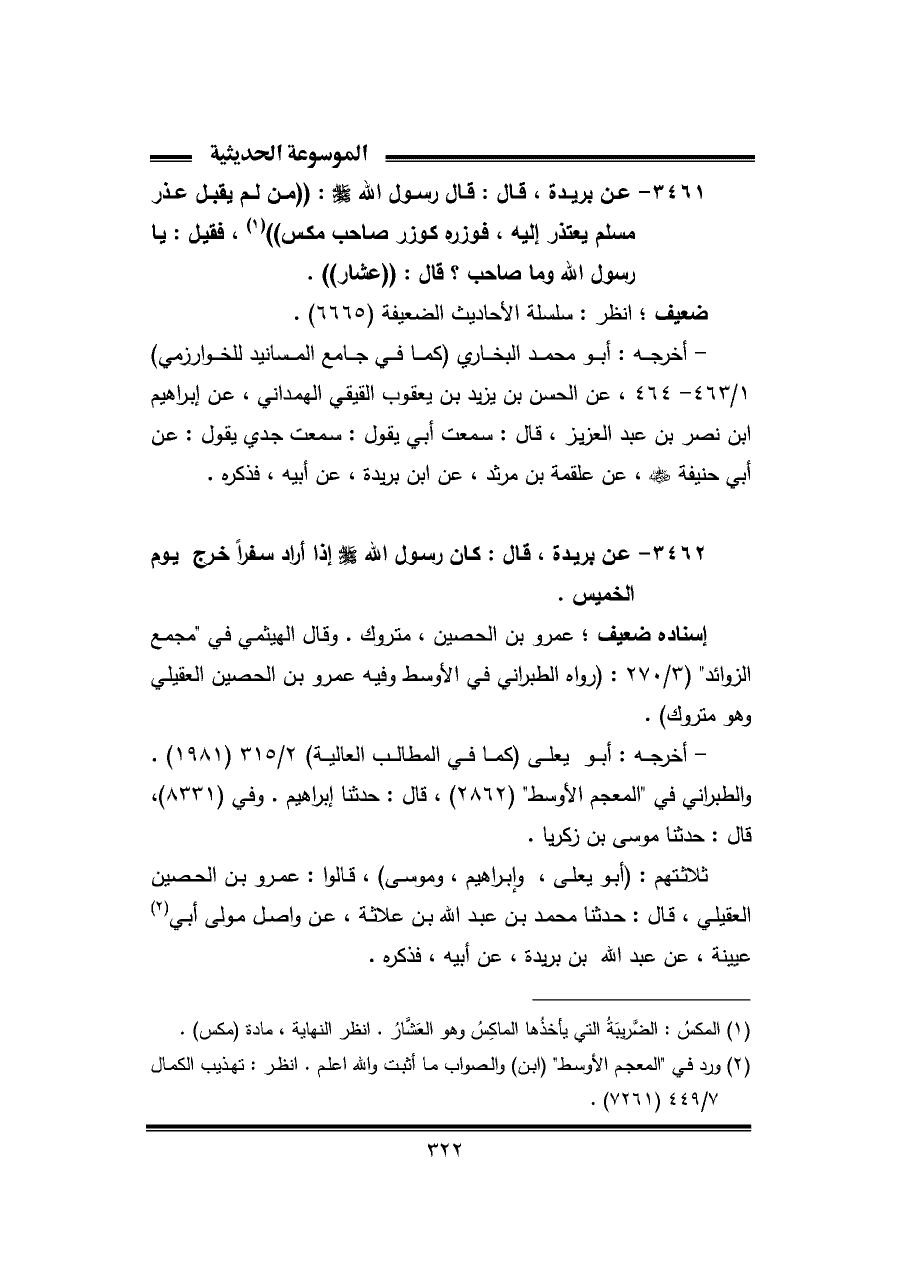 ٣٤٦١ - عن بريدة، قال: قال رسول الله - صلى الله عليه وسلم -: "من لم يقبل عذر مسلم يعتذر إليه، فوزره كوزر صاحب مكس" (¬١)، فقيل: يا رسول الله وما صاحب؟ قال: "عشار".