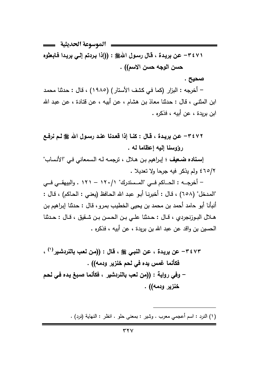 ٣٤٧٣ - عن بريدة، عن النبي - صلى الله عليه وسلم -، قال: "من لعب بالنردشير (¬١)، فكأنما غمس يده في لحم خنزير ودمه".