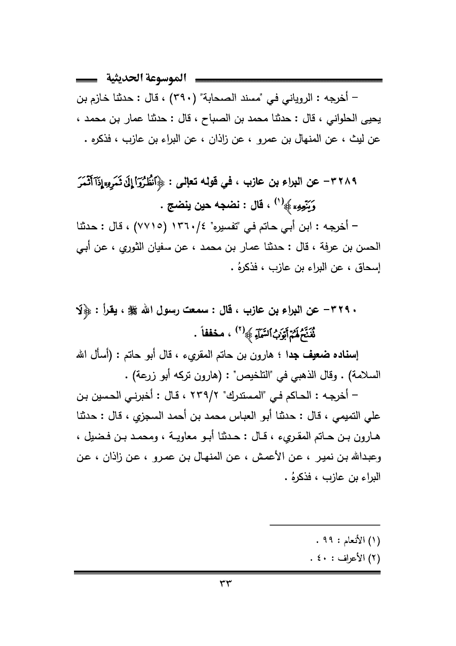 ٣٢٨٩ - عن البراء بن عازب، في قوله تعالى: {انْظُرُوا إِلَى ثَمَرِهِ إِذَا أَثْمَرَ وَيَنْعِهِ} (¬١)، قال: نضجه حين ينضج.