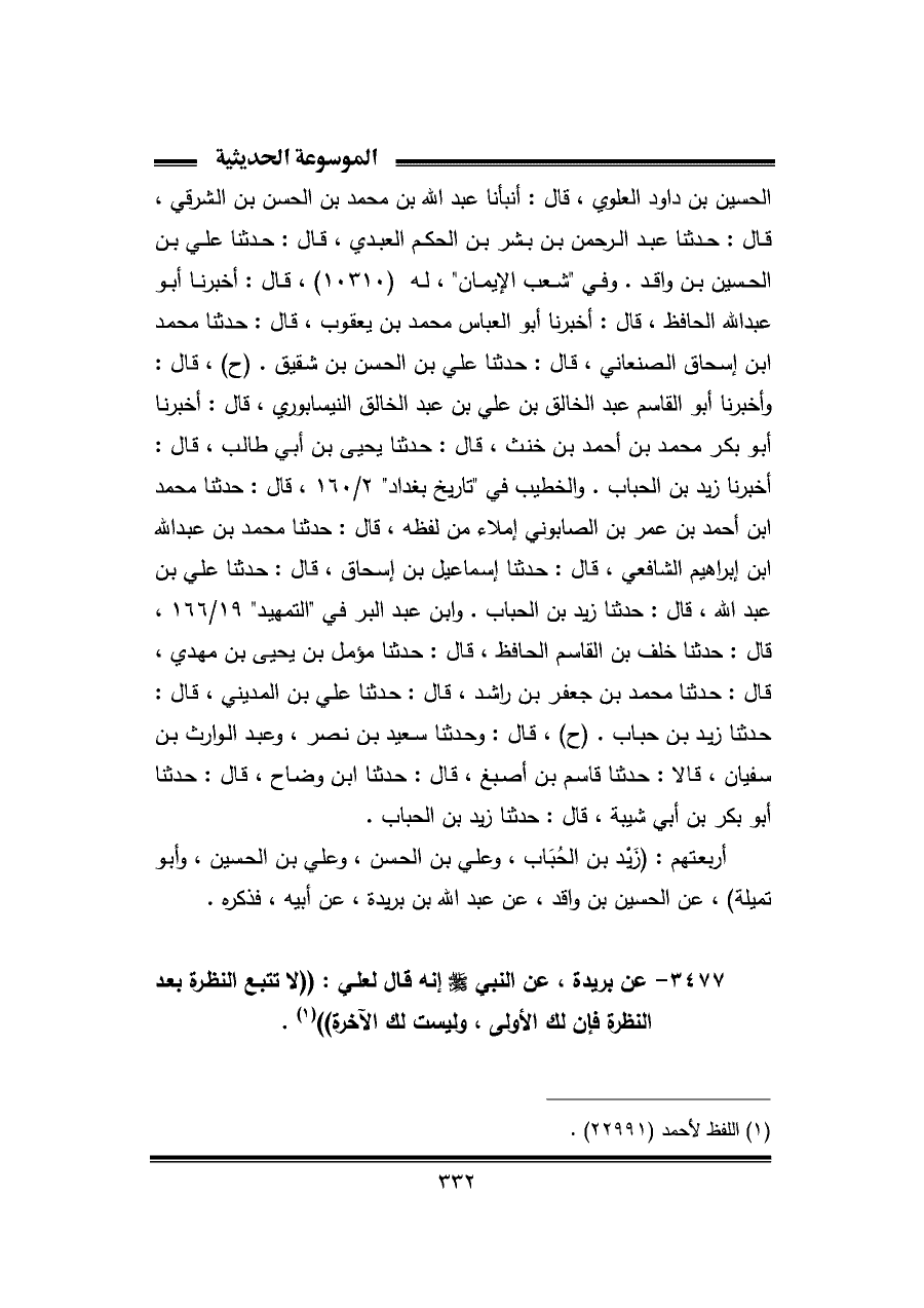 ٣٤٧٧ - عن بريدة، عن النبي - صلى الله عليه وسلم - إنه قال لعلي: "لا تتبع النظرة بعد النظرة فإن لك الأولى، وليست لك الآخرة" (¬١).