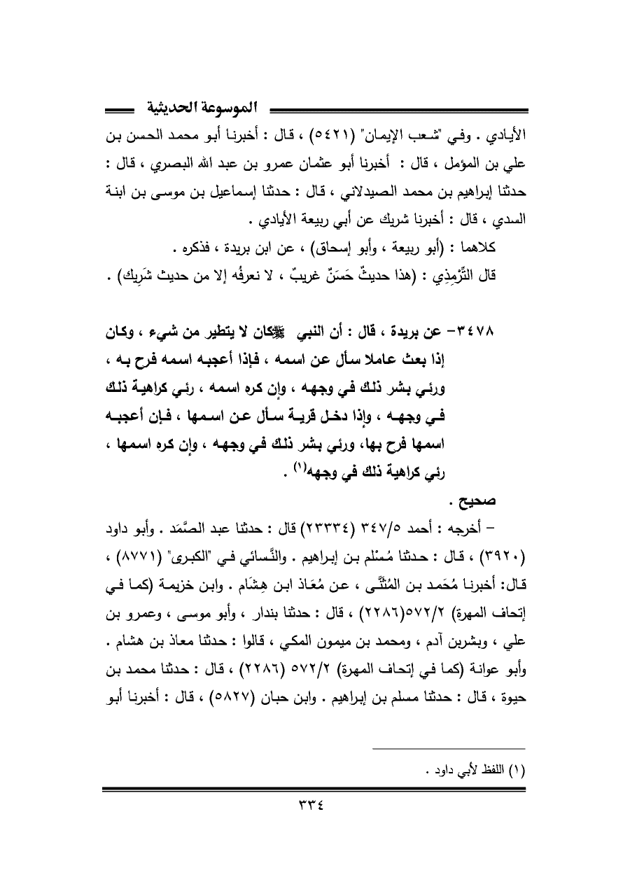 ٣٤٧٨ - عن بريدة، قال: أن النبي - صلى الله عليه وسلم - كان لا يتطير من شيء، وكان إذا بعث عاملا سأل عن اسمه، فإذا أعجبه اسمه فرح به، ورئي بشر ذلك في وجهه، وإن كره اسمه، رئي كراهية ذلك في وجهه، وإذا دخل قرية سأل عن اسمها، فإن أعجبه اسمها فرح بها، ورئي بشر ذلك في وجهه، وإن كره اسمها، رئي كراهية ذلك في وجهه (¬١).