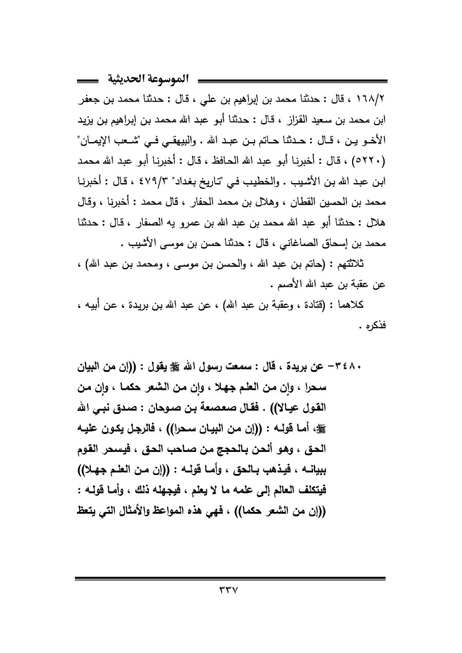 ٣٤٨٠ - عن بريدة، قال: سمعت رسول الله - صلى الله عليه وسلم - يقول: "إن من البيان سحرا، وإن من العلم جهلا، وإن من الشعر حكما، وإن من القول عيالا". فقال صعصعة بن صوحان: صدق نبي الله - صلى الله عليه وسلم -، أما قوله: "إن من البيان سحرا"، فالرجل يكون عليه الحق، وهو ألحن بالحجج من صاحب الحق، فيسحر القوم ببيانه، فيذهب بالحق، وأما قوله: "إن من العلم جهلا" فيتكلف العالم إلى علمه ما لا يعلم، فيجهله ذلك، وأما قوله: "إن من الشعر حكما"، فهي هذه المواعظ والأمثال التي يتعظ