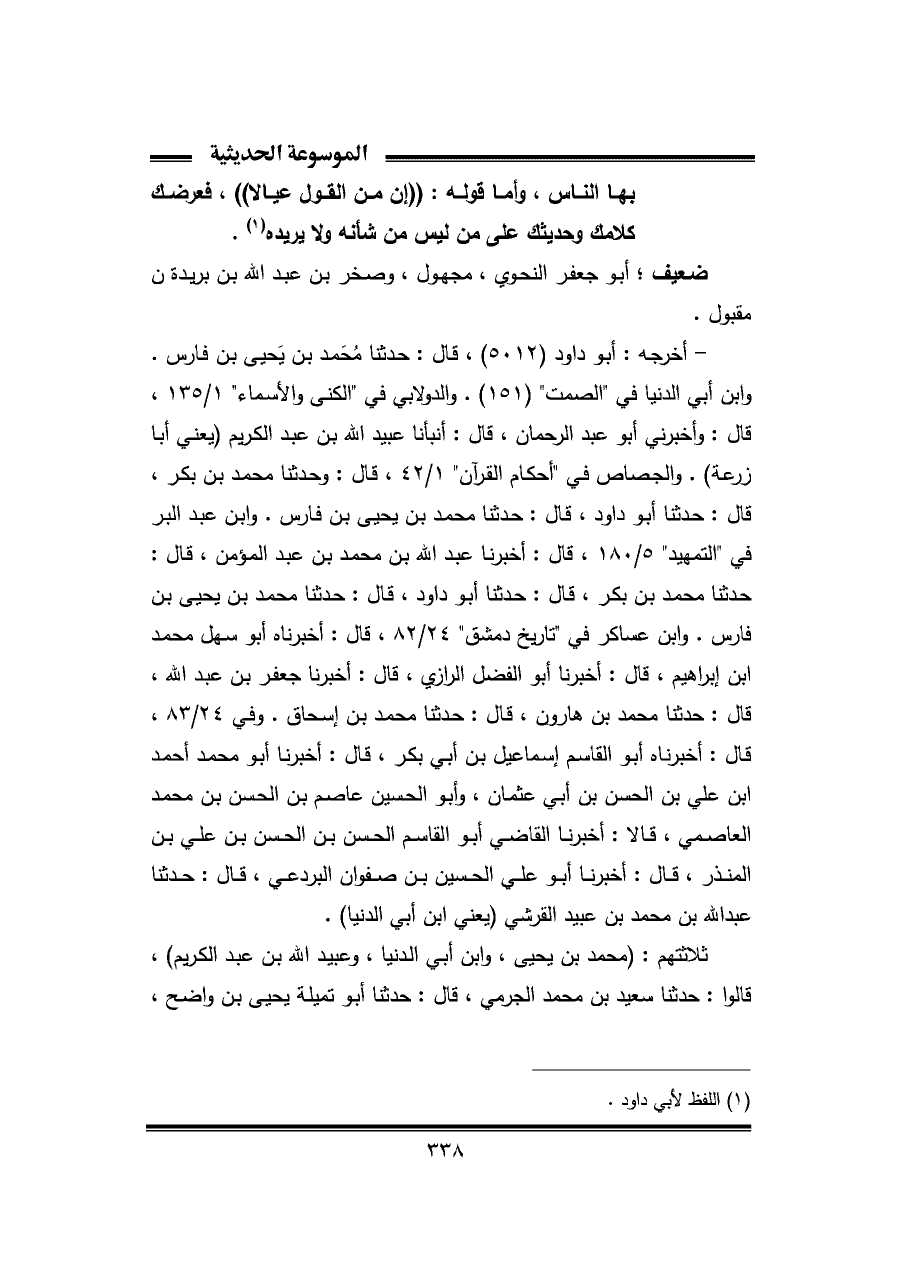 - أخرجه: أبو داود (٥٠١٢)، قال: حدثنا مُحَمد بن يَحيى بن فارس. وابن أبي الدنيا في "الصمت" (١٥١). والدولابي في "الكنى والأسماء" ١/ ١٣٥، قال: وأخبرني أبو عبد الرحمان، قال: أنبأنا عبيد الله بن عبد الكريم (يعني أبا زرعة). والجصاص في "أحكام القرآن" ١/ ٤٢، قال: وحدثنا محمد بن بكر، قال: حدثنا أبو داود، قال: حدثنا محمد بن يحيى بن فارس. وابن عبد البر في "التمهيد" ٥/ ١٨٠، قال: أخبرنا عبد الله بن محمد بن عبد المؤمن، قال: حدثنا محمد بن بكر، قال: حدثنا أبو داود، قال: حدثنا محمد بن يحيى بن فارس. وابن عساكر في "تاريخ دمشق" ٨٢/ ٢٤، قال: أخبرناه أبو سهل محمد بن إبراهيم، قال: أخبرنا أبو الفضل الرازي، قال: أخبرنا جعفر بن عبد الله، قال: حدثنا محمد بن هارون، قال: حدثنا محمد بن إسحاق. وفي ٢٤/ ٨٣، قال: أخبرناه أبو القاسم إسماعيل بن أبي بكر، قال: أخبرنا أبو محمد أحمد بن علي بن الحسن بن أبي عثمان، وأبو الحسين عاصم بن الحسن بن محمد العاصمي، قالا: أخبرنا القاضي أبو القاسم الحسن بن الحسن بن علي بن المنذر، قال: أخبرنا أبو علي الحسين بن صفوان البردعي، قال: حدثنا عبد الله بن محمد بن عبيد القرشي (يعني ابن أبي الدنيا).