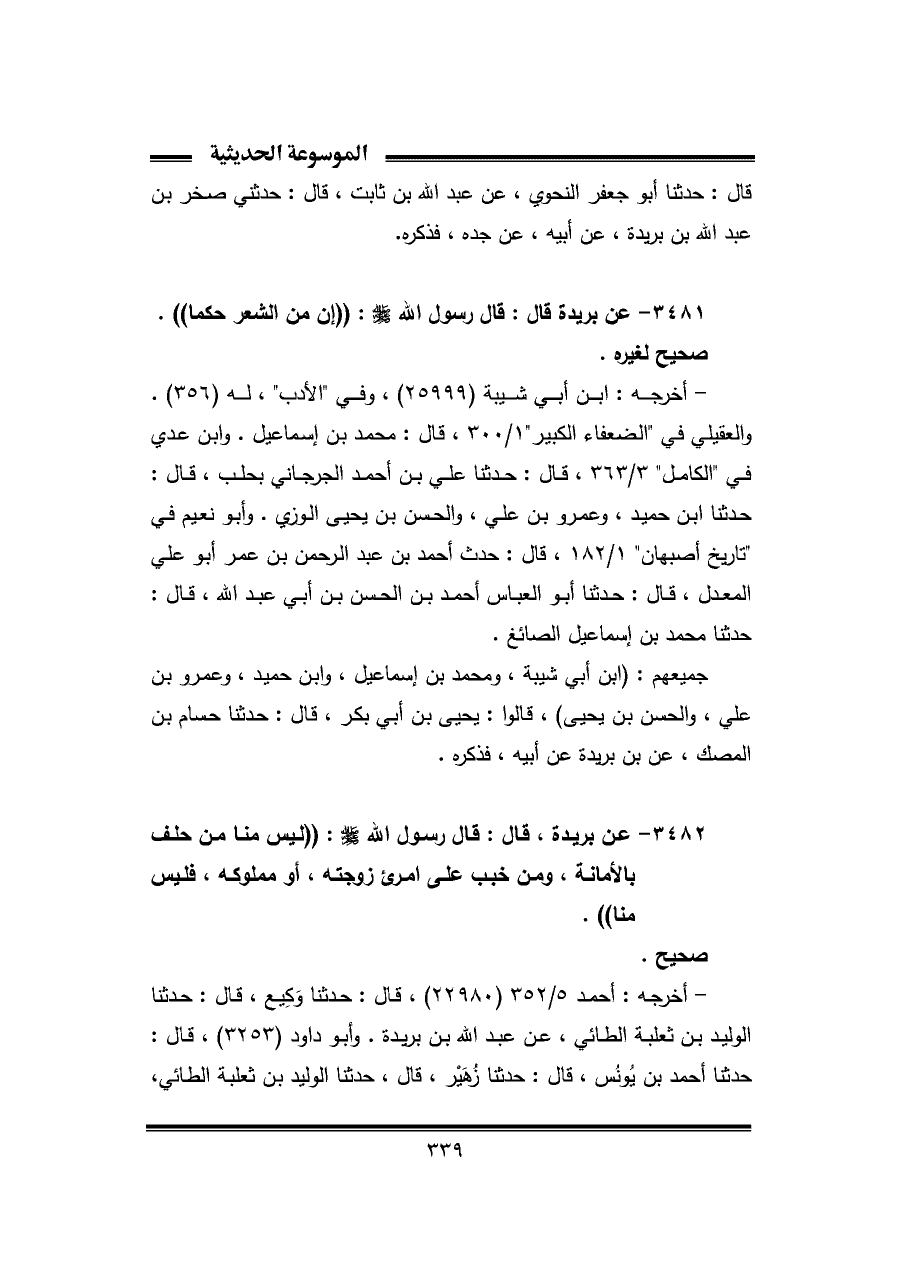 ٣٤٨١ - عن بريدة قال: قال رسول الله - صلى الله عليه وسلم -: "إن من الشعر حكما".