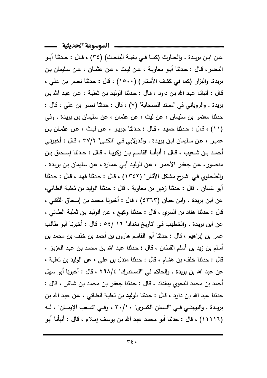 عن ابن بريدة. والحارث (كما في بغية الباحث) (٣٤)، قال: حدثنا أبو النضر، قال: حدثنا أبو معاوية، عن ليث، عن عثمان، عن سليمان بن بريدة. والبزار (كما في كشف الأستار) (١٥٠٠)، قال: حدثنا نصر بن علي، قال: أنبأنا عبد الله بن داود، قال: حدثنا الوليد بن ثعلبة، عن عبد الله بن بريدة. والروياني في "مسند الصحابة" (٧)، قال: حدثنا نصر بن علي، قال: حدثنا معتمر بن سليمان، عن ليث، عن عثمان، عن سليمان بن بريدة. وفي (١١)، قال: حدثنا حميد، قال: حدثنا جرير، عن ليث، عن عثمان بن عمير، عن سليمان ابن بريدة. والدولابي في "الكنى" ٢/ ٣٧، قال: أخبرني أحمد بن شعيب، قال: أنبأنا القاسم بن زكريا، قال: حدثنا إسحاق بن منصور، عن جعفر الأحمر، عن الوليد أبي عمارة، عن سليمان بن بريدة. والطحاوي في "شرح مشكل الآثار" (١٣٤٢)، قال: حدثنا فهد، قال: حدثنا أبو غسان، قال: حدثنا زهير بن معاوية، قال: حدثنا الوليد بن ثعلبة الطائي، عن ابن بريدة. وابن حبان (٤٣٦٣)، قال: أخبرنا محمد بن إسحاق الثقفي، قال: حدثنا هناد بن السري، قال: حدثنا وكيع، عن الوليد بن ثعلبة الطائي، عن ابن بريدة. والخطيب في "تاريخ بغداد" ١٦/ ٥٤، قال: أخبرنا أبو طالب عمر بن إبراهيم، قال: حدثنا أبو القاسم هارون بن أحمد بن خلف بن محمد بن أسلم بن زيد بن أسلم القطان، قال: حدثنا عبد الله بن محمد بن عبد العزيز، قال: حدثنا خلف بن هشام، قال: حدثنا مندل بن على، عن الوليد بن ثعلبة، عن عبد الله بن بريدة. والحاكم في "المستدرك" ٤/ ٢٩٨، قال: أخبرنا أبو سهل أحمد بن محمد النحوي ببغداد، قال: حدثنا جعفر بن محمد بن شاكر، قال: حدثنا عبد الله بن داود، قال: حدثنا الوليد بن ثعلبة الطائي، عن عبد الله بن بريدة. والبيهقي في "السنن الكبرى" ١٠/ ٣٠، وفي "شعب الإيمان"، له (١١١١٦)، قال: حدثنا أبو محمد عبد الله بن يوسف إملاء، قال: أنبأنا أبو