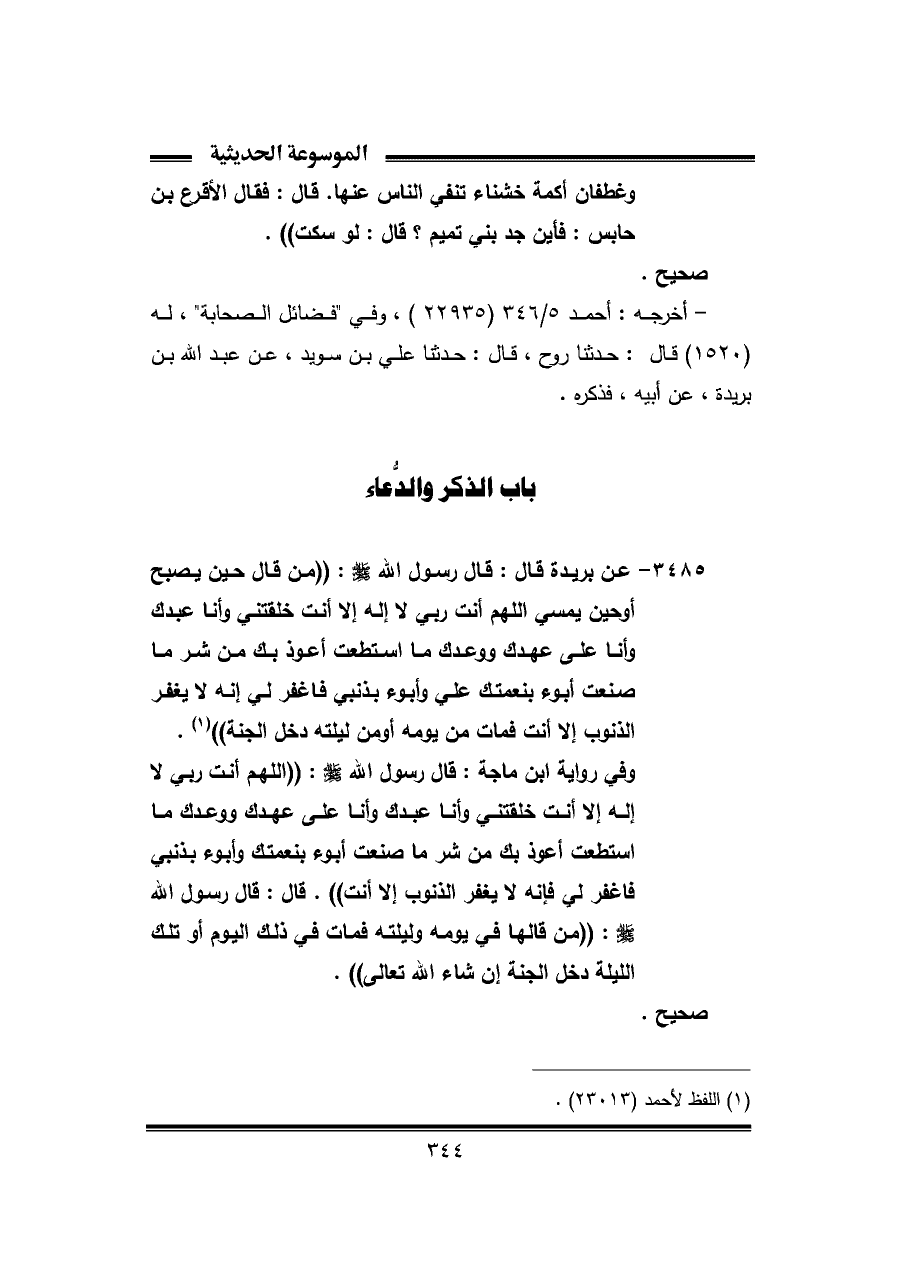 ٣٤٨٥ - عن بريدة قال: قال رسول الله - صلى الله عليه وسلم -: "من قال حين يصبح أو حين يمسي اللهم أنت ربي لا إله إلا أنت خلقتني وأنا عبدك وأنا على عهدك ووعدك ما استطعت أعوذ بك من شر ما صنعت أبوء بنعمتك علي وأبوء بذنبي فاغفر لي إنه لا يغفر الذنوب إلا أنت فمات من يومه أو من ليلته دخل الجنة" (¬١).