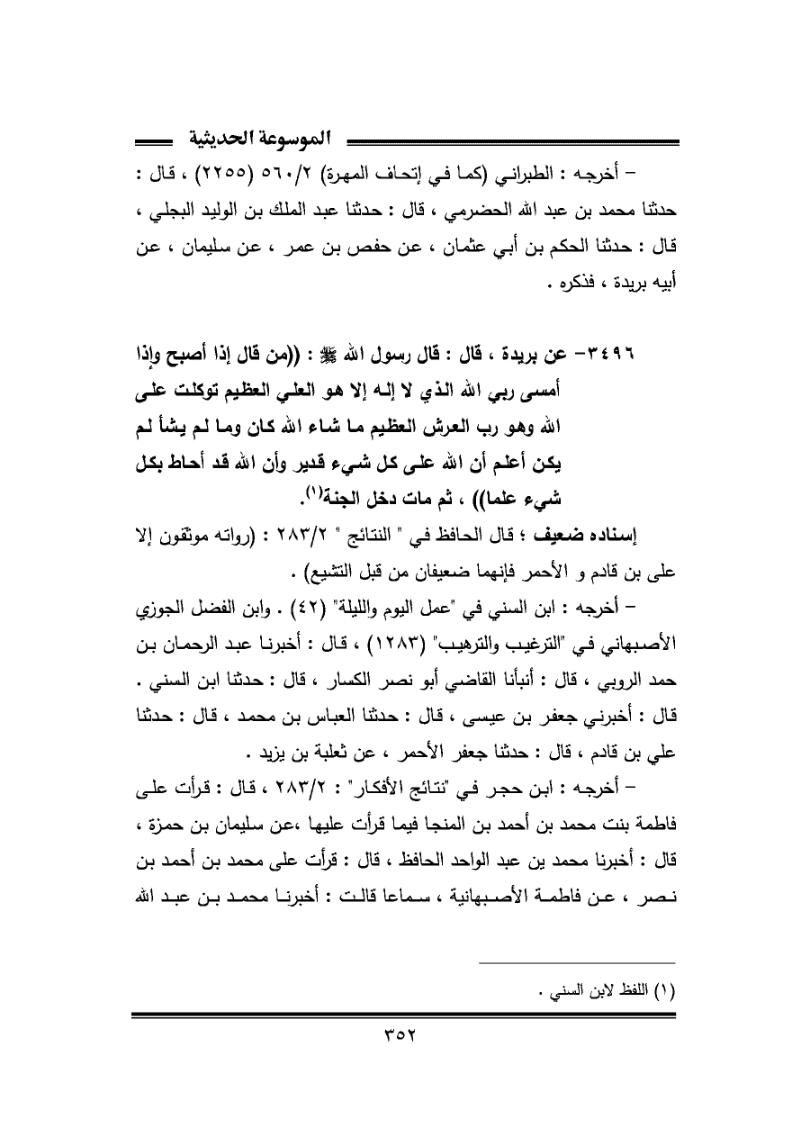 ٣٤٩٦ - عن بريدة، قال: قال رسول الله - صلى الله عليه وسلم -: "من قال إذا أصبح وإذا أمسى ربي الله الذي لا إله إلا هو العلي العظيم توكلت على الله وهو رب العرش العظيم ما شاء الله كان وما لم يشأ لم يكن أعلم أن الله على كل شيء قدير وأن الله قد أحاط بكل شيء علما"، ثم مات دخل الجنة (¬١).