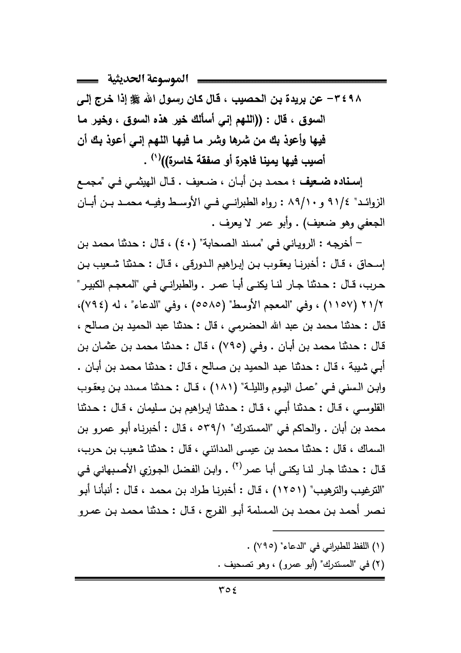 ٣٤٩٨ - عن بريدة بن الحصيب، قال كان رسول الله - صلى الله عليه وسلم - إذا خرج إلى السوق، قال: "اللهم إني أسألك خير هذه السوق، وخير ما فيها وأعوذ بك من شرها وشر ما فيها اللهم إني أعوذ بك أن أصيب فيها يمينا فاجرة أو صفقة خاسرة" (¬١).