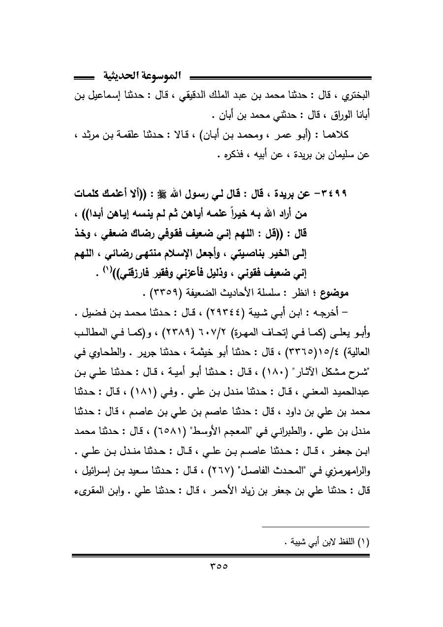 ٣٤٩٩ - عن بريدة، قال: قال لي رسول الله - صلى الله عليه وسلم -: "ألا أعلمك كلمات من أراد الله به خيرًا علمه إياهن ثم لم ينسه إياهن أبدا"، قال: "قل: اللهم إني ضعيف فقوني رضاك ضعفي، وخذ إلى الخير بناصيتي، واجعل الإسلام منتهى رضائي، اللهم إني ضعيف فقوني، وذليل فأعزني وفقير فارزقني" (¬١).