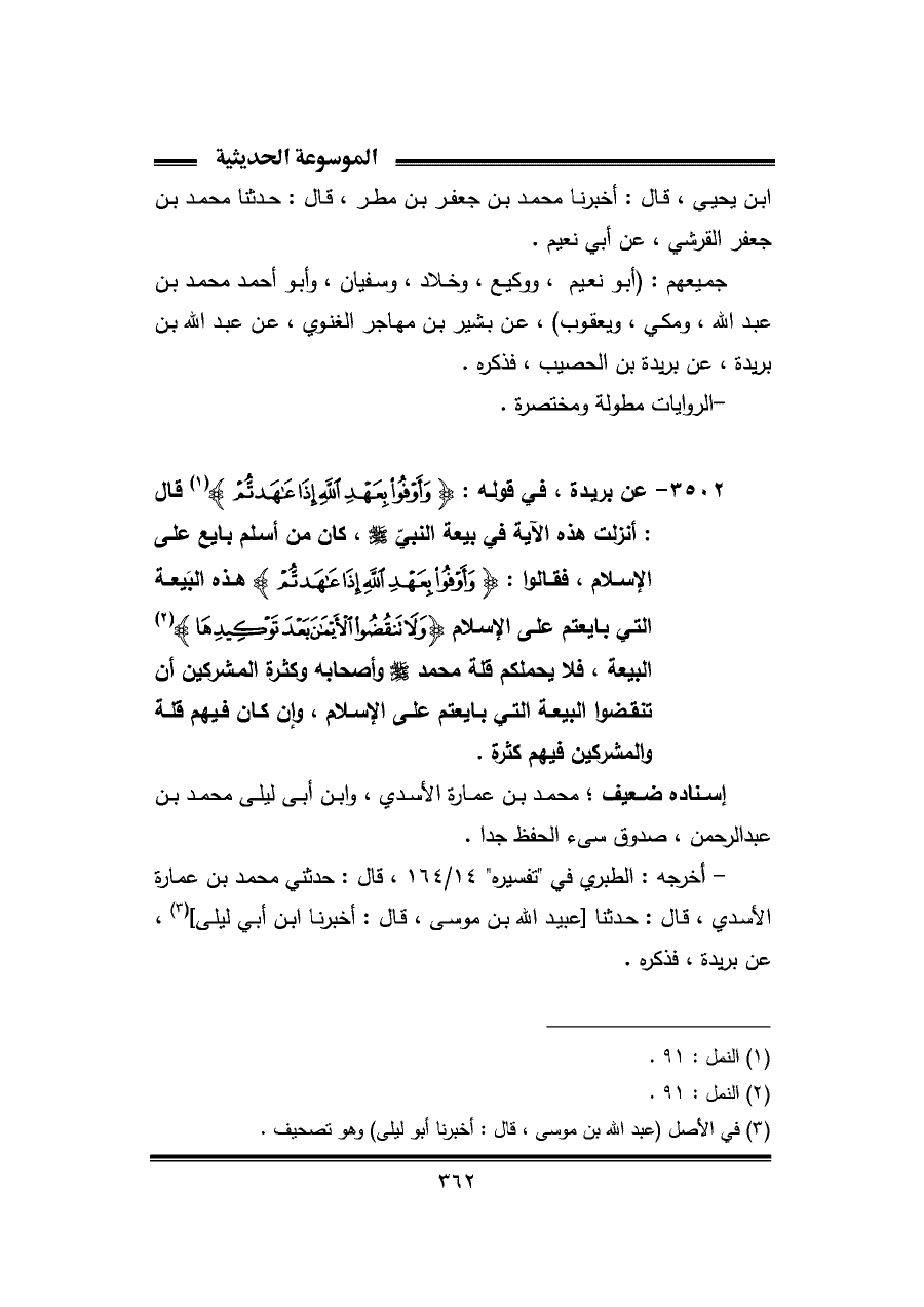 ٣٥٠٢ - عن بُرَيْدَة، في قوله: {وَأَوْفُوا بِعَهْدِ اللَّهِ إِذَا عَاهَدْتُمْ} (¬١) قال: أنزلت هذه الآية في بيعة النَّبِيّ - صلى الله عليه وسلم -، كان من أسلم بايع على الإسم، فقالوا: {وَأَوْفُوا بِعَهْدِ اللَّهِ إِذَا عَاهَدْتُمْ} هذه البَيعة التي بايعتم على الإسلام {وَلَا تَنْقُضُوا الْأَيْمَانَ بَعْدَ تَوْكِيدِهَا} (¬٢) البيعة، فلا يحملكم قلة محمد - صلى الله عليه وسلم - وأصحابه وكثرة المشركين أن تنقضوا البيعة التي بايعتم على الإسلام، وإن كان فيهم قلة والمشركين فيهم كثرة.