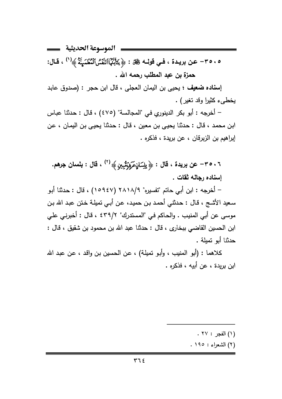 ٣٥٠٥ - عن بُرَيْدَة، في قوله - عَزَّ وَجَلَّ -: {يَاأَيَّتُهَا النَّفْسُ الْمُطْمَئِنَّةُ} (¬١)، قال: حمزة بن عبد المطلب رحمه اللّه.