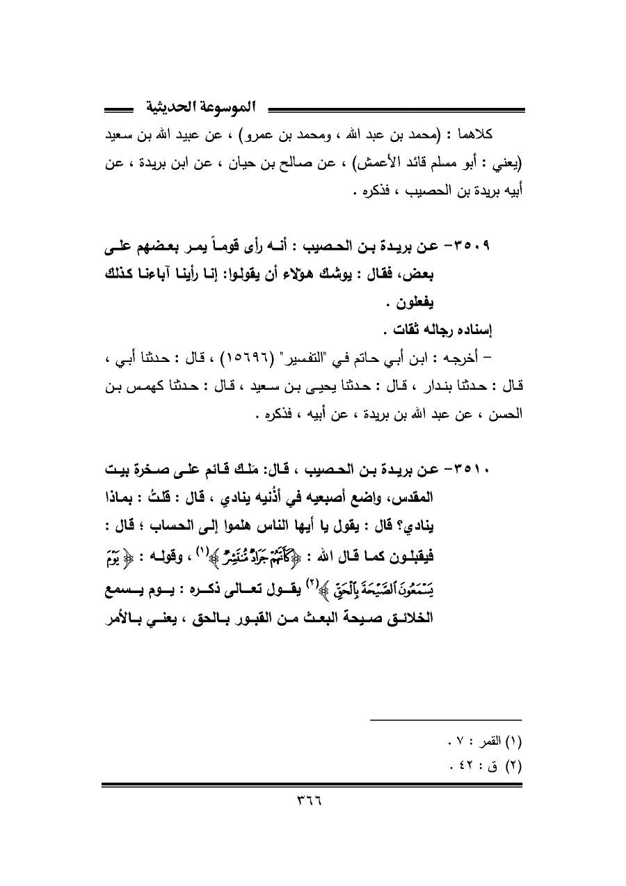 ٣٥١٠ - عن بُرَيْدَة بن الحصيب، قال: مَلك قائم على صخرة بيت المقدس، واضع أصبعيه في أذُنيه ينادي، قال: قلتُ: بماذا ينادي؟ قال: يقول يا أيها الناس هلموا إلى الحساب؛ قال: فيقبلون كما قال اللّه: {كَأَنَّهُمْ جَرَادٌ مُنْتَشِرٌ} (١)، وقوله: {يَوْمَ يَسْمَعُونَ الصَّيْحَةَ بِالْحَقِّ} (٢) يقول تعالى ذكره: يوم يسمع الخلائق صيحة البعث من القبور بالحق، يعني بالأمر