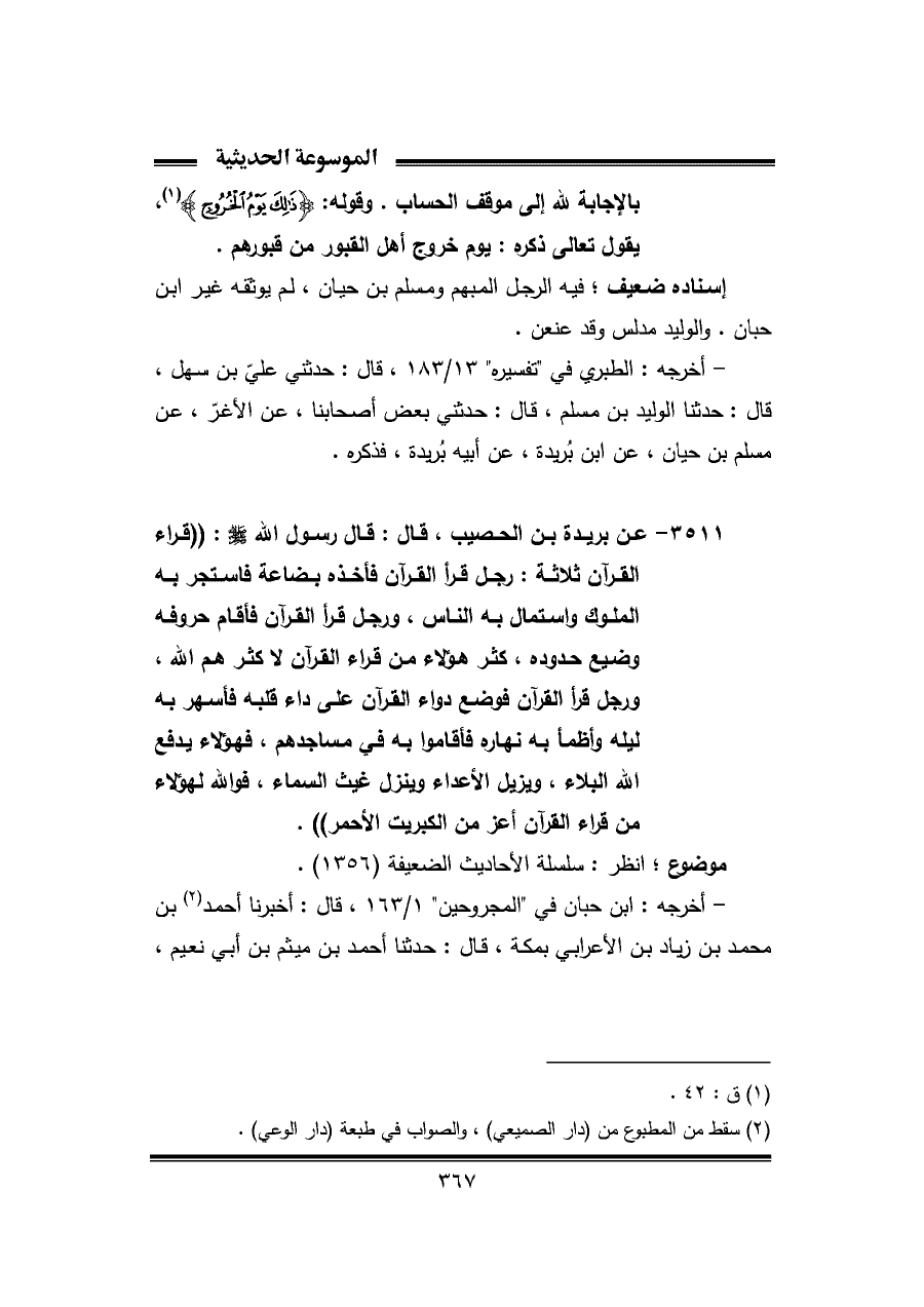- أخرجه: الطبري في "تفسيره" ١٣/ ١٨٣ قال: حدثني عليّ بن سهل، قال: حَدَّثَنَا الوليد بن مسلم، قال: حدثني بعض أصحابنا، عن الأغرّ، عن مسلم بن حيان، عن ابن بُريدة، عن أبيه بُريدة، فذكره.