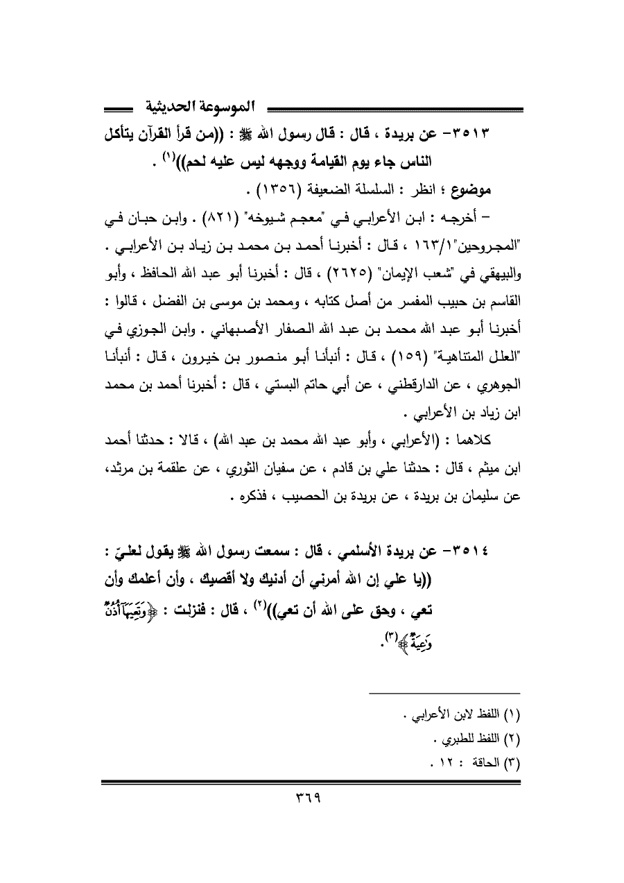 ٣٥١٣ - عن بُرَيْدَة، قال: قال رسول اللّه - صلى الله عليه وسلم -: "من قرأ القرآن يتأكل الناس جاء يوم القيامة ووجهه ليس عليه لحم" (¬١).