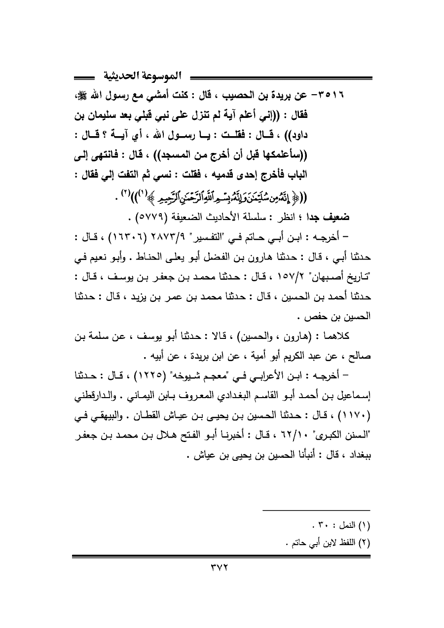 ٣٥١٦ - عن بُرَيْدَة بن الحصيب، قال: كنت أمشي مع رسول اللّه - صلى الله عليه وسلم -، فقال: "إني أعلم آية لم تنزل على نبي قبلي بعد سليمان بن داود"، قال: فقلت: يا رسول اللّه، أي آية؟ قال: "سأعلمكها قبل أن أخرج من المسجد"، قال: فانتهى إلى الباب فأخرج إحدى قدميه، فقلت: نسي ثم التفت إلي فقال: " {إِنَّهُ مِنْ سُلَيْمَانَ وَإِنَّهُ بِسْمِ اللَّهِ الرَّحْمَنِ الرَّحِيمِ} (¬١) " (¬٢).