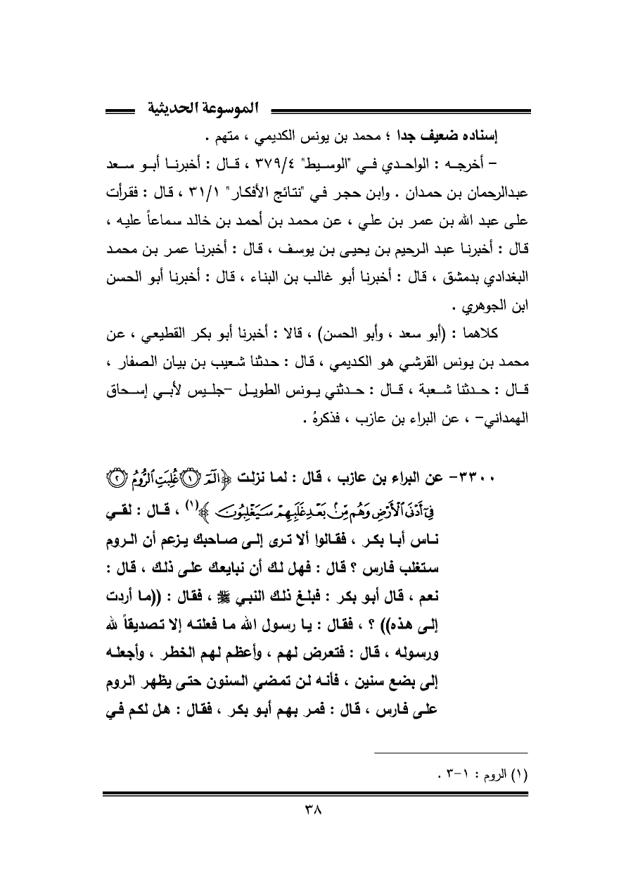 ٣٣٠٠ - عن البراء بن عازب، قال: لما نزلت {الم (١) غُلِبَتِ الرُّومُ (٢) فِي أَدْنَى الْأَرْضِ وَهُمْ مِنْ بَعْدِ غَلَبِهِمْ سَيَغْلِبُونَ} (¬١)، قال: لقي ناس أبا بكر، فقالوا ألا ترى إلى صاحبك يزعم أن الروم ستغلب فارس؟ قال: فهل لك أن نبايعك على ذلك، قال: نعم، قال أبو بكر: فبلغ ذلك النبي - صلى الله عليه وسلم -، فقال: "ما أردت إلى هذه"؟، فقال: يا رسول الله ما فعلته إلا تصديقًا لله ورسوله، قال: فتعرض لهم، وأعظم لهم الخطر، وأجعله إلى بضع سنين، فإنه لن تمضي السنون حتى يظهر الروم على فارس، قال: فمر بهم أبو بكر، فقال: هل لكم في