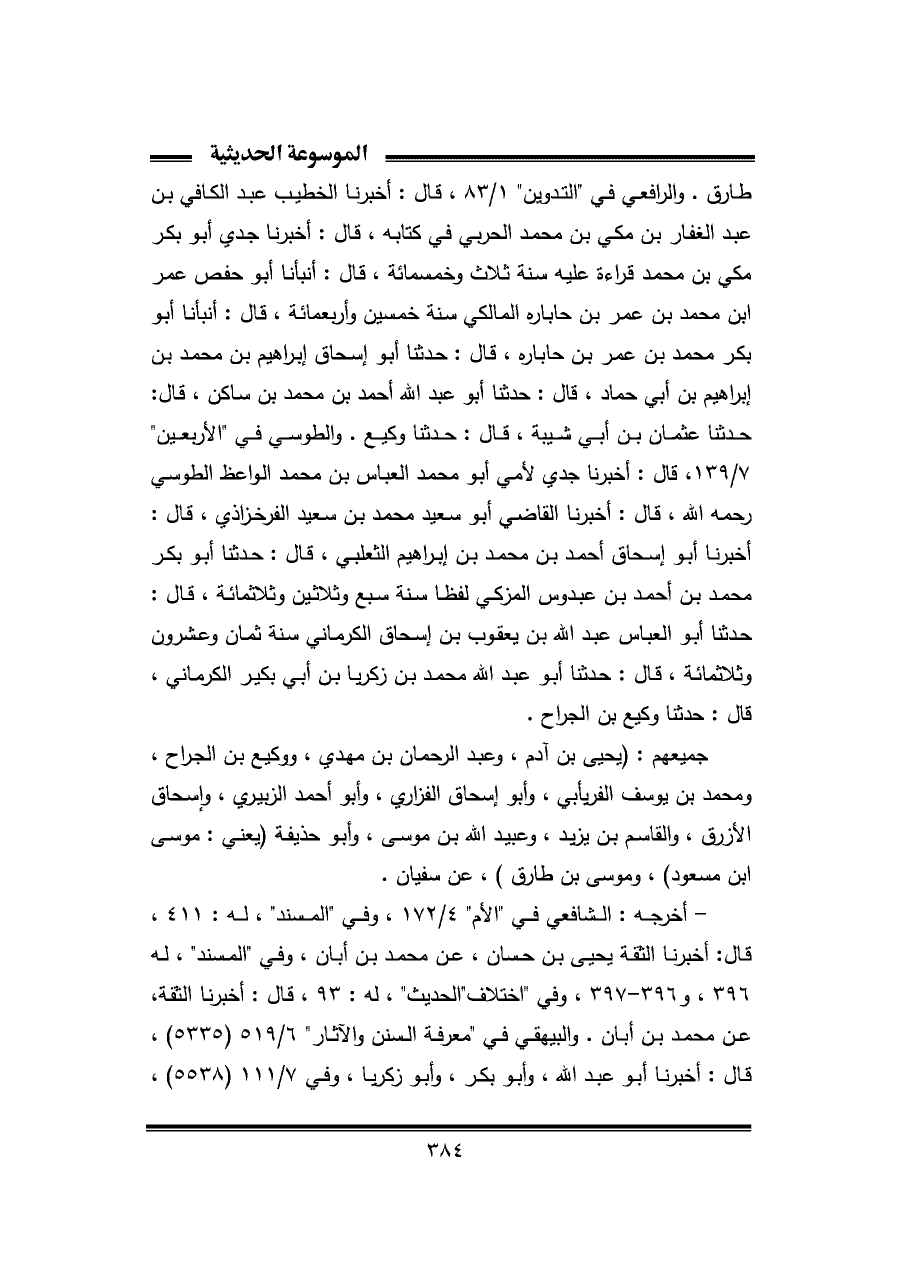 طارق. والرافعي في "التدوين" ١/ ٨٣، قال: أخبرنا الخطيب عبد الكافي بن عبد الغفار بن مكي بن محمد الحربي في كتابه، قال: أخبرنا جدي أبو بكر مكي بن محمد قراءة عليه سنة ثلاث وخمسمائة، قال: أنبأنا أبو حفص عمر بن محمد بن عمر بن حاباره المالكي سنة خمسين وأربعمائة، قال: أنبأنا أبو بكر محمد بن عمر بن حاباره، قال: حَدَّثَنَا أبو إسحاق إبراهيم بن محمد بن إبراهيم بن أبي حماد، قال: حَدَّثَنَا أبو عبد الله أحمد بن محمد بن ساكن، قال: حَدَّثَنَا عثمان بن أبي شيبة، قال: حَدَّثَنَا وكيع. والطوسي في "الأربعين" ٧/ ١٣٩، قال: أخبرنا جدي لأمي أبو محمد العباس بن محمد الواعظ الطوسي رحمه الله، قال: أخبرنا القاضي أبو سعيد محمد بن سعيد الفرخزاذي، قال: أخبرنا أبو إسحاق أحمد بن محمد بن إبراهيم الثعلبي، قال: حَدَّثَنَا أبو بكر محمد بن أحمد بن عبدوس المزكي لفظا سنة سبع وثلاثين وثلاثمائة، قال: حَدَّثَنَا أبو العباس عبد الله بن يعقوب بن إسحاق الكرماني سنة ثمان وعشرون وثلاثمائة، قال: حَدَّثَنَا أبو عبد الله محمد بن زكريا بن أبي بكير الكرماني، قال: حَدَّثَنَا وكيع بن الجراح.