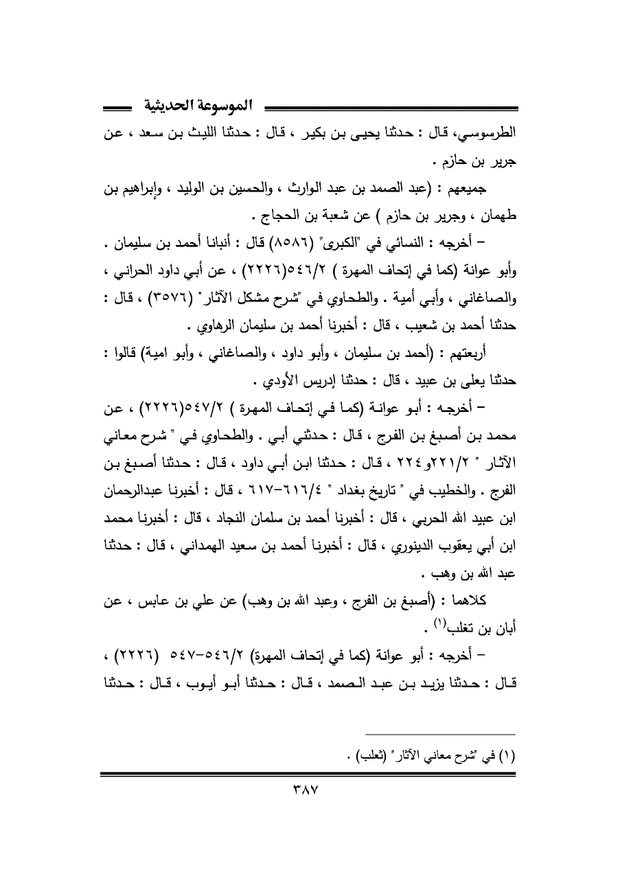 الطرسوسي، قال: حَدَّثَنَا يحيى بن بكير، قال: حَدَّثَنَا الليث بن سعد، عن جرير بن حازم.