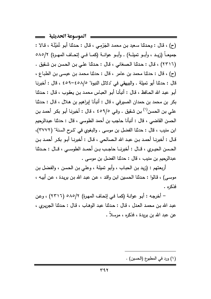 (ح)، قال: وحدثنا سعيد بن محمد الجَرْمِي، قال: حَدَّثَنَا أبو تُمَيْلَة، قالا: جميعًا (زيد، وأبو تميلة). وأبو عوانة (كما في إتحاف المهرة) ٢/ ٥٨٥ (٢٣١٦)، قال: حَدَّثَنَا الصغاني، قال: حَدَّثَنَا علي بن الحسن بن شقيق. (ح)، قال: حَدَّثَنَا محمد بن عامر، قال: حَدَّثَنَا محمد بن عيسى بن الطباع، قال: حَدَّثَنَا أبو تميلة. والبيهقي في "دلائل النبوة" ٥/ ٤٥٨ - ٤٥٩، قال: أخبرنا أبو عبد الله الحافظ، قال: أنبأنا أبو العباس محمد بن يعقوب، قال: حَدَّثَنَا بكر بن محمد بن حمدان الصيرفي، قال: أنبأنا إبراهيم بن هلال، قال: حَدَّثَنَا علي بن الحسن (¬١) بن شقيق. وفي ٥/ ٤٥٩، قال: أخبرنا أبو بكر أحمد بن الحسن القاضي، قال: أنبأنا حاجب بن أحمد الطوسي، قال: حَدَّثَنَا عبد الرحيم بن منيب، قال: حَدَّثَنَا الفضل بن موسى. والبغوي في "شرح السنة" (٣٧٧٢)، قال: أخبرنا أحمد بن عبد الله الصالحي، قال: أخبرنا أبو بكر أحمد بن الحسن الحيري، قال: أخبرنا حاجب بن أحمد الطوسي، قال: حَدَّثَنَا عبد الرحيم بن منيب، قال: حَدَّثَنَا الفضل بن موسى.