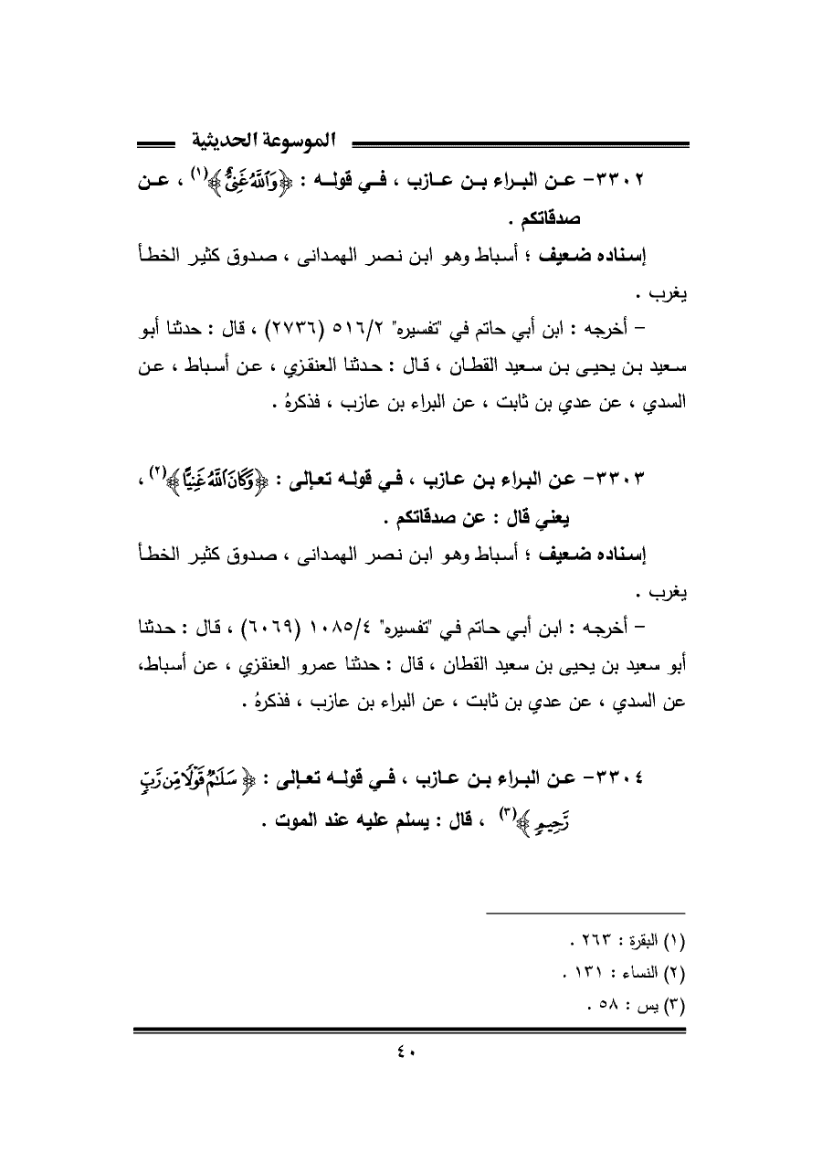 ٣٣٠٣ - عن البراء بن عازب، في قوله تعالى: {وَكَانَ اللَّهُ غَنِيًّا} (¬٢)، يعني قال: عن صدقاتكم.