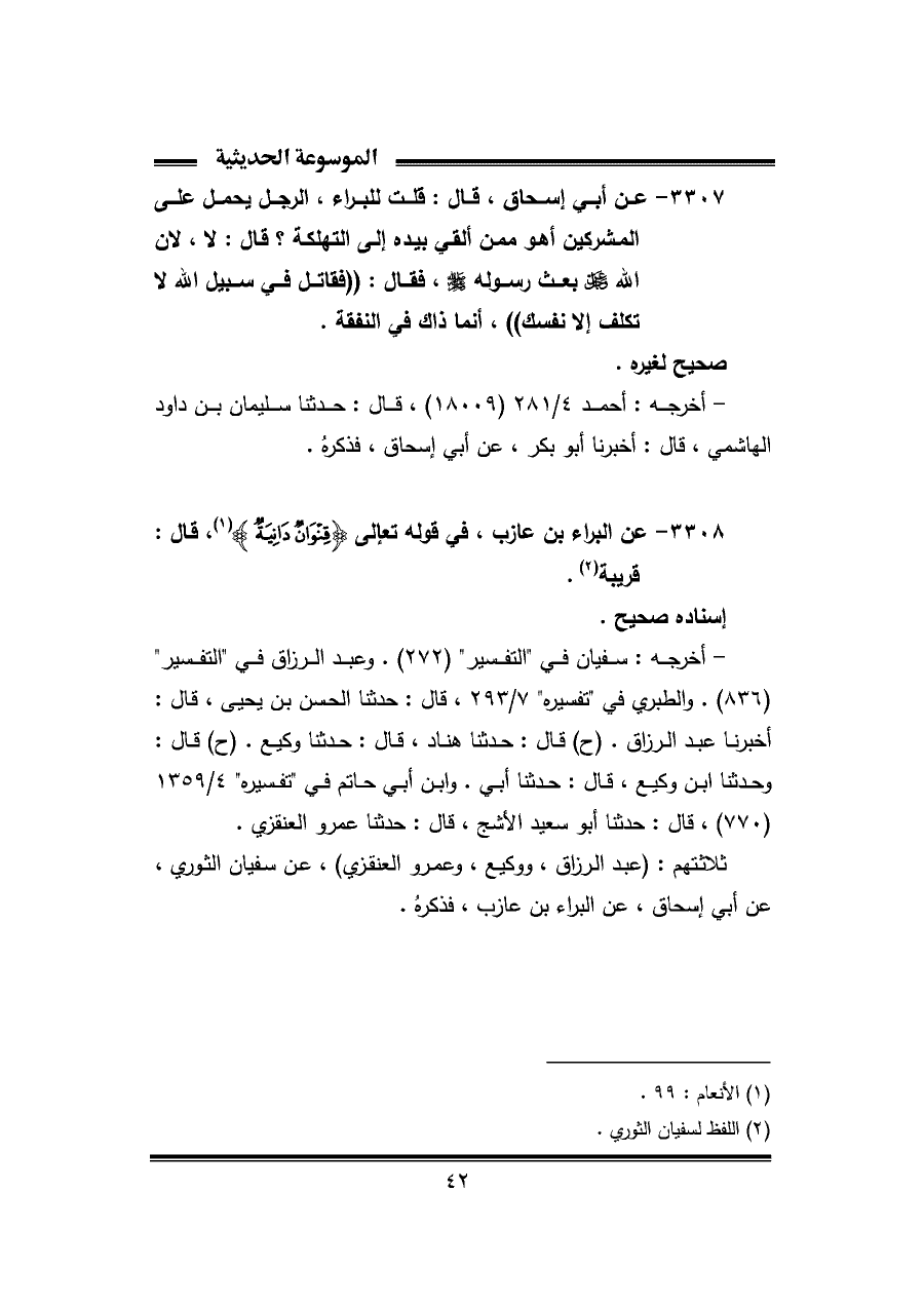 ٣٣٠٧ - عن أبي إسحاق، قال: قلت للبراء، الرجل يحمل على المشركين أهو ممن ألقي بيده إلى التهلكة؟ قال: لا، لان الله - عز وجل - بعث رسوله - صلى الله عليه وسلم -، فقال: "فقائل في سبيل الله لا تكلف إلا نفسك"، إنما ذاك في النفقة.
