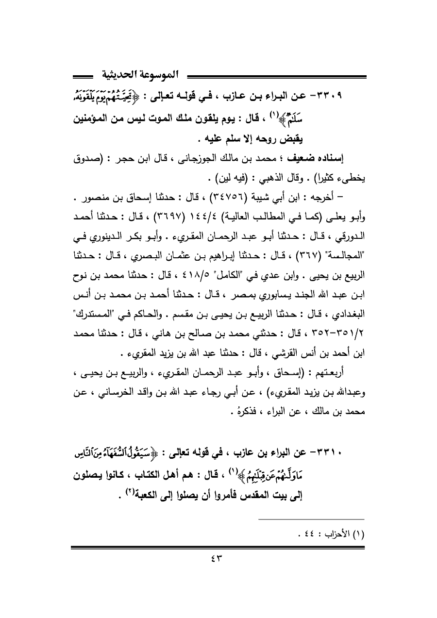 ٣٣٠٩ - عن البراء بن عازب، في قوله تعالى: {تَحِيَّتُهُمْ يَوْمَ يَلْقَوْنَهُ سَلَامٌ} (¬١)، قال: يوم يلقون ملك الموت ليس من المؤمنين يقبض روحه إلا سلم عليه.