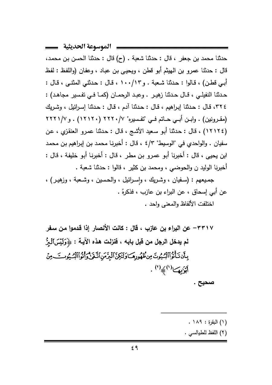 ٣٣١٧ - عن البراء بن عازب، قال: كانت الأنصار إذا قدموا من سفر لم يدخل الرجل من قبل بابه، فنزلت هذه الآية: {وَلَيْسَ الْبِرُّ بِأَنْ تَأْتُوا الْبُيُوتَ مِنْ ظُهُورِهَا وَلَكِنَّ الْبِرَّ مَنِ اتَّقَى وَأْتُوا الْبُيُوتَ مِنْ أَبْوَابِهَا (¬١)} (¬٢).