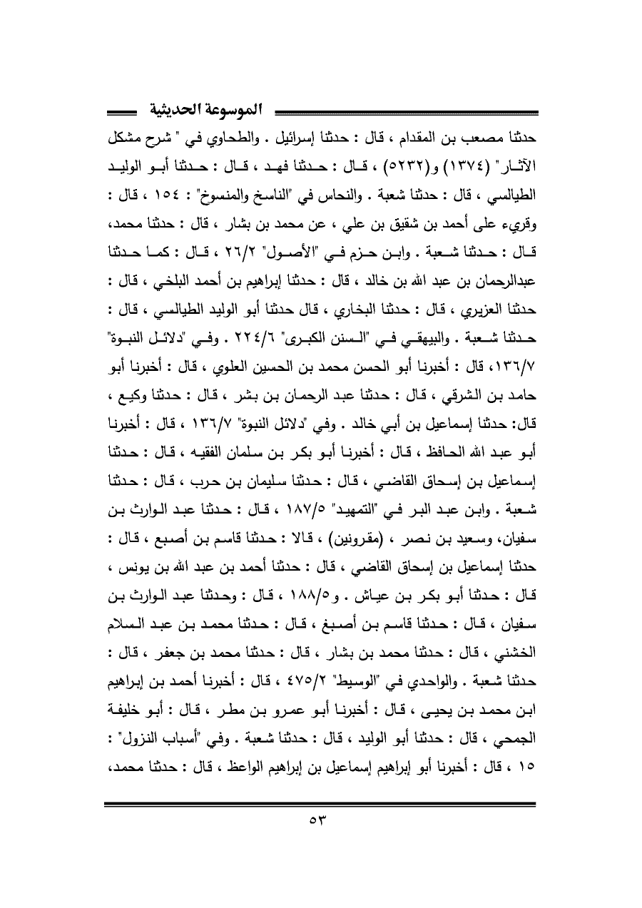 حدثنا مصعب بن المقدام، قال: حدثنا إسرائيل. والطحاوي في "شرح مشكل الآثار" (١٣٧٤) و (٥٢٣٢)، قال: حدثنا فهد، قال: حدثنا أبو الوليد الطيالسي، قال: حدثنا شعبة. والنحاس في "الناسخ والمنسوخ": ١٥٤، قال: وقريء على أحمد بن شقيق بن علي، عن محمد بن بشار، قال: حدثنا محمد، قال: حدثنا شعبة. وابن حزم في "الأصول" ٢/ ٢٦، قال: كما حدثنا عبد الرحمان بن عبد الله بن خالد، قال: حدثنا إبراهيم بن أحمد البلخي، قال: حدثنا العزيري، قال: حدثنا البخاري، قال حدثنا أبو الوليد الطيالسي، قال: حدثنا شعبة. والبيهقي في "السنن الكبرى" ٦/ ٢٢٤. وفي "دلائل النبوة" ٧/ ١٣٦، قال: أخبرنا أبو الحسن محمد بن الحسين العلوي، قال: أخبرنا أبو حامد بن الشرقي، قال: حدثنا عبد الرحمان بن بشر، قال: حدثنا وكيع، قال: حدثنا إسماعيل بن أبي خالد. وفي "دلائل النبوة" ٧/ ١٣٦، قال: أخبرنا أبو عبد الله الحافظ، قال: أخبرنا أبو بكر بن سلمان الفقيه، قال: حدثنا إسماعيل بن إسحاق القاضي، قال: حدثنا سليمان بن حرب، قال: حدثنا شعبة. وابن عبد البر في "التمهيد" ٥/ ١٨٧، قال: حدثنا عبد الوارث بن سفيان، وسعيد بن نصر، (مقرونين)، قالا: حدثنا قاسم بن أصبع، قال: حدثنا إسماعيل بن إسحاق القاضي، قال: حدثنا أحمد بن عبد الله بن يونس، قال: حدثنا أبو بكر بن عياش. و ٥/ ١٨٨، قال: وحدثنا عبد الوارث بن سفيان، قال: حدثنا قاسم بن أصبغ، قال: حدثنا محمد بن عبد السلام الخشني، قال: حدثنا محمد بن بشار، قال: حدثنا محمد بن جعفر، قال: حدثنا شعبة. والواحدي في "الوسيط" ٢/ ٤٧٥، قال: أخبرنا أحمد بن إبراهيم بن محمد بن يحيى، قال: أخبرنا أبو عمرو بن مطر، قال: أبو خليفة الجمحي، قال: حدثنا أبو الوليد، قال: حدثنا شعبة. وفي "أسباب النزول": ١٥، قال: أخبرنا أبو إبراهيم إسماعيل بن إبراهيم الواعظ، قال: حدثنا محمد،