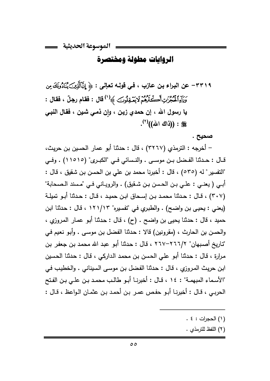 ٣٣١٩ - عن البراء بن عازب، في قوله تعالى: {إِنَّ الَّذِينَ يُنَادُونَكَ مِنْ وَرَاءِ الْحُجُرَاتِ أَكْثَرُهُمْ لَا يَعْقِلُونَ} (¬١) قال: فقام رجلٌ، فقال: يا رسول الله، إن حمدي زين، وإن ذمي شين، فقال النبي - صلى الله عليه وسلم -: "ذاك الله" (¬٢).