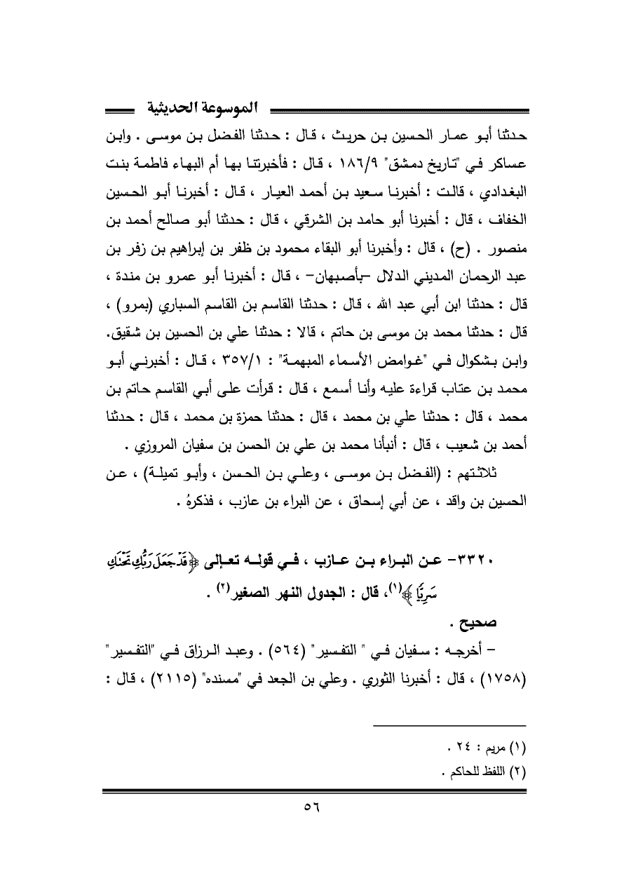 ٣٣٢٠ - عن البراء بن عازب، في قوله تعالى {قَدْ جَعَلَ رَبُّكِ تَحْتَكِ سَرِيًّا} (¬١)، قال: الجدول النهر الصغير (¬٢).