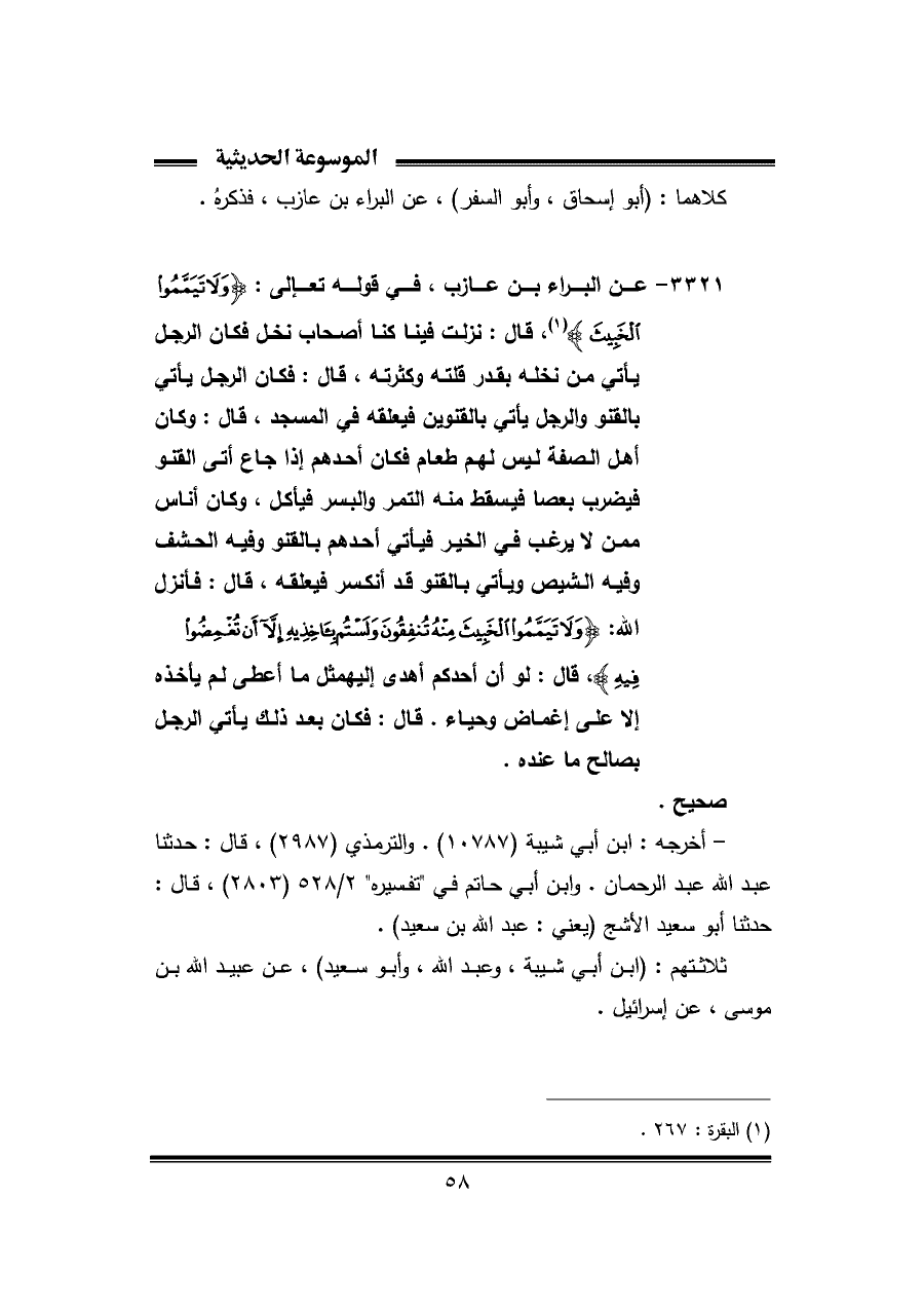 ٣٣٢١ - عن البراء بن عازب، في قوله تعالى: {وَلَا تَيَمَّمُوا الْخَبِيثَ} (¬١)، قال: نزلت فينا كنا أصحاب نخل فكان الرجل يأتي من نخله بقدر قلته وكثرته، قال: فكان الرجل يأتي بالقنو والرجل يأتي بالقنوين فيعلقه في المسجد، قال: وكان أهل الصفة ليس لهم طعام فكان أحدهم إذا جاع أتى القنو فيضرب بعصا فيسقط منه التمر والبسر فيأكل، وكان أناس ممن لا يرغب في الخير فيأتي أحدهم بالقنو وفيه الحشف وفيه الشيص ويأتي بالقنو قد انكسر فيعلقه، قال: فأنزل الله: {وَلَا تَيَمَّمُوا الْخَبِيثَ مِنْهُ تُنْفِقُونَ وَلَسْتُمْ بِآخِذِيهِ إِلَّا أَنْ تُغْمِضُوا فِيهِ}، قال: لو أن أحدكم أهدى إليه مثل ما أعطى لم يأخذه إلا على إغماض وحياء. قال: فكان بعد ذلك يأتي الرجل بصالح ما عنده.