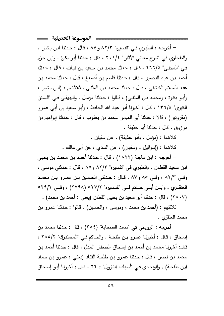 - أخرجه: الروياني في "مسند الصحابة" (٣٨٤)، قال: حدثنا محمد بن إسحاق، قال: أخبرنا عمرو بن طلحة. والحاكم في "المستدرك" ٢/ ٢٨٥، محمد بن نصر، قال: حدثنا عمرو بن طلحة القناد (يعني: عمرو بن حماد بن طلحة). والواحدي في أسباب النزول: ٦٢، قال: أخبرنا أبو إسحاق