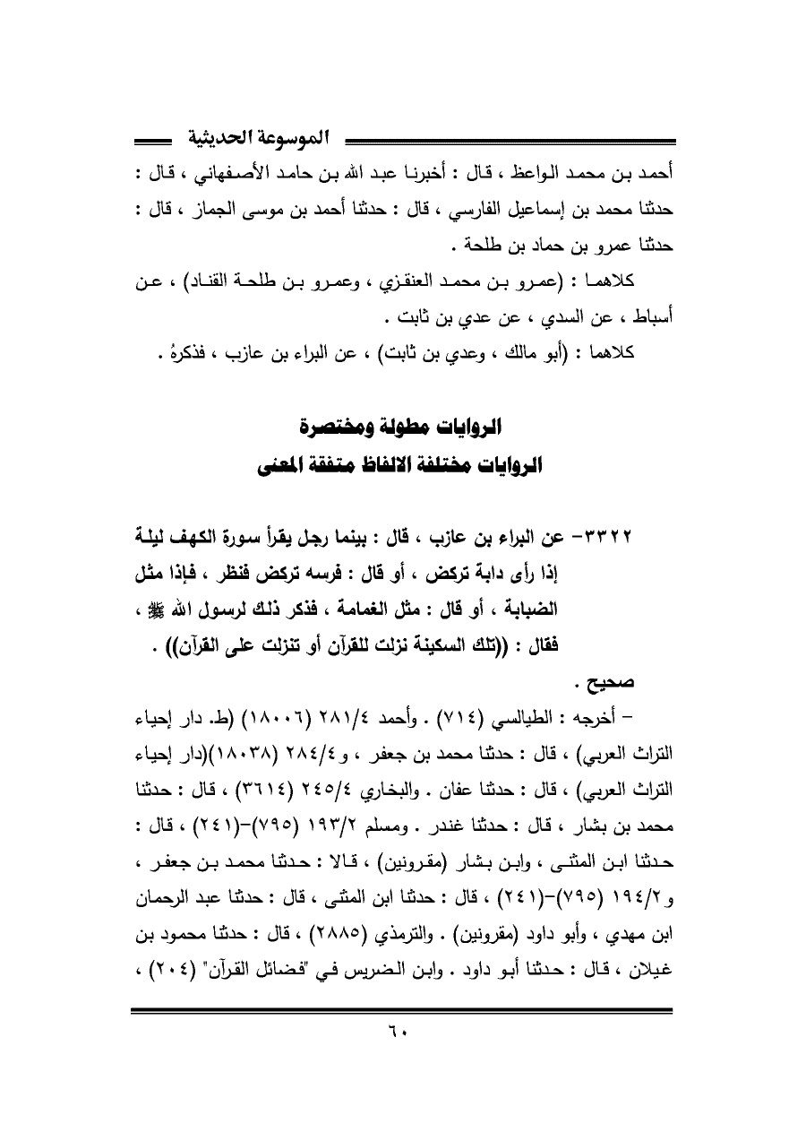٣٣٢٢ - عن البراء بن عازب، قال: بينما رجل يقرأ سورة الكهف ليلة إذا رأى دابة تركض، أو قال: فرسه تركض فنظر، فإذا مثل الضبابة، أو قال: مثل الغمامة، فذكر ذلك لرسول الله - صلى الله عليه وسلم -، فقال: "تلك السكينة نزلت للقرآن أو تنزلت على القرآن".
