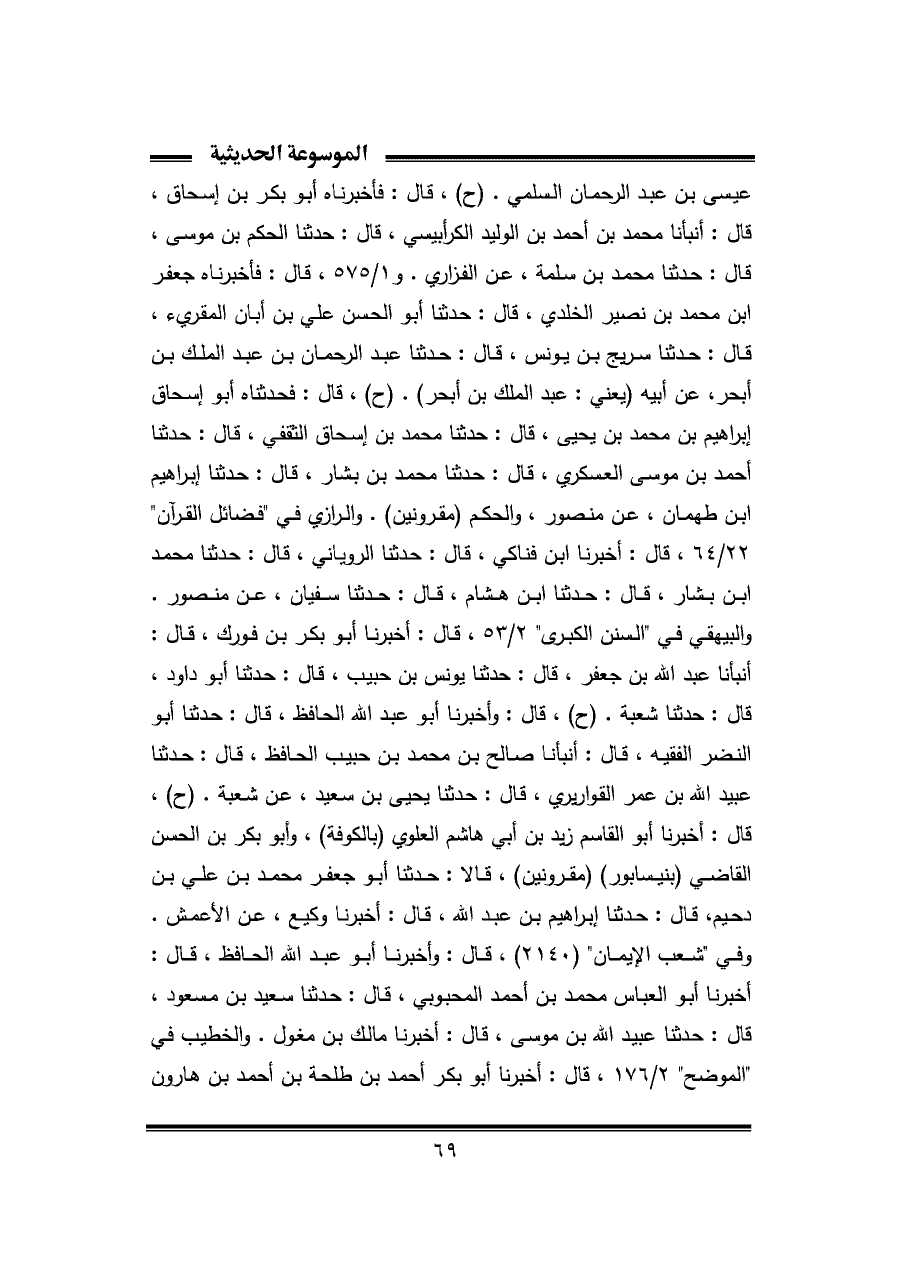 عيسى بن عبد الرحمان السلمي. (ح)، قال: فأخبرناه أبو بكر بن إسحاق، قال: أنبأنا محمد بن أحمد بن الوليد الكرابيسي، قال: حدثنا الحكحم بن موسى، قال: حدثنا محمد بن سلمة، عن الفزاري. و ١/ ٥٧٥، قال: فأخبرناه جعفر بن محمد بن نصير الخلدي، قال: حدثنا أبو الحسن علي بن أبان المقريء، قال: حدثنا سريج بن يونس، قال: حدثنا عبد الرحمان بن عبد الملك بن أبحر، عن أبيه (يعني: عبد الملك بن أبحر). (ح)، قال: فحدثناه أبو إسحاق إبراهيم بن محمد بن يحيى، قال: حدثنا محمد بن إسحاق الثقفي، قال: حدثنا أحمد بن موسى العسكري، قال: حدثنا محمد بن بشار، قال: حدثنا إبراهيم بن طهمان، عن منصور، والحكم (مقرونين). والرازي في "فضائل القرآن" ٢٢/ ٦٤، قال: أخبرنا ابن فناكي، قال: حدثنا الروياني، قال: حدثنا محمد بن بشار، قال: حدثنا ابن هشام، قال: حدثنا سفيان، عن منصور. والبيهقي في "السنن الكبرى" ٢/ ٥٣، قال: أخبرنا أبو بكر بن فورك، قال: أنبأنا عبد الله بن جعفر، قال: حدثنا يونس بن حبيب، قال: حدثنا أبو داود، قال: حدثنا شعبة. (ح)، قال: وأخبرنا أبو عبد الله الحافظ، قال: حدثنا أبو النضر الفقيه، قال: أنبأنا صالح بن محمد بن حبيب الحافظ، قال: حدثنا عبيد الله بن عمر القواريري، قال: حدثنا يحيى بن سعيد، عن شعبة. (ح)، قال: أخبرنا أبو القاسم زيد بن أبي هاشم العلوي (بالكوفة)، وأبو بكر بن الحسن القاضي (بنيسابور) (مقرونين)، قالا: حدثنا أبو جعفر محمد بن علي بن دحيم، قال: حدثنا إبراهيم بن عبد الله، قال: أخبرنا وكيع، عن الأعمش. وفي "شعب الإيمان" (٢١٤٠)، قال: وأخبرنا أبو عبد الله الحافظ، قال: أخبرنا أبو العباس محمد بن أحمد المحبوبي، قال: حدثنا سعيد بن مسعود، قال: حدثنا عبيد الله بن موسى، قال: أخبرنا مالك بن مغول. والخطيب في "الموضح" ٢/ ١٧٦، قال: أخبرنا أبو بكر أحمد بن طلحة بن أحمد بن هارون