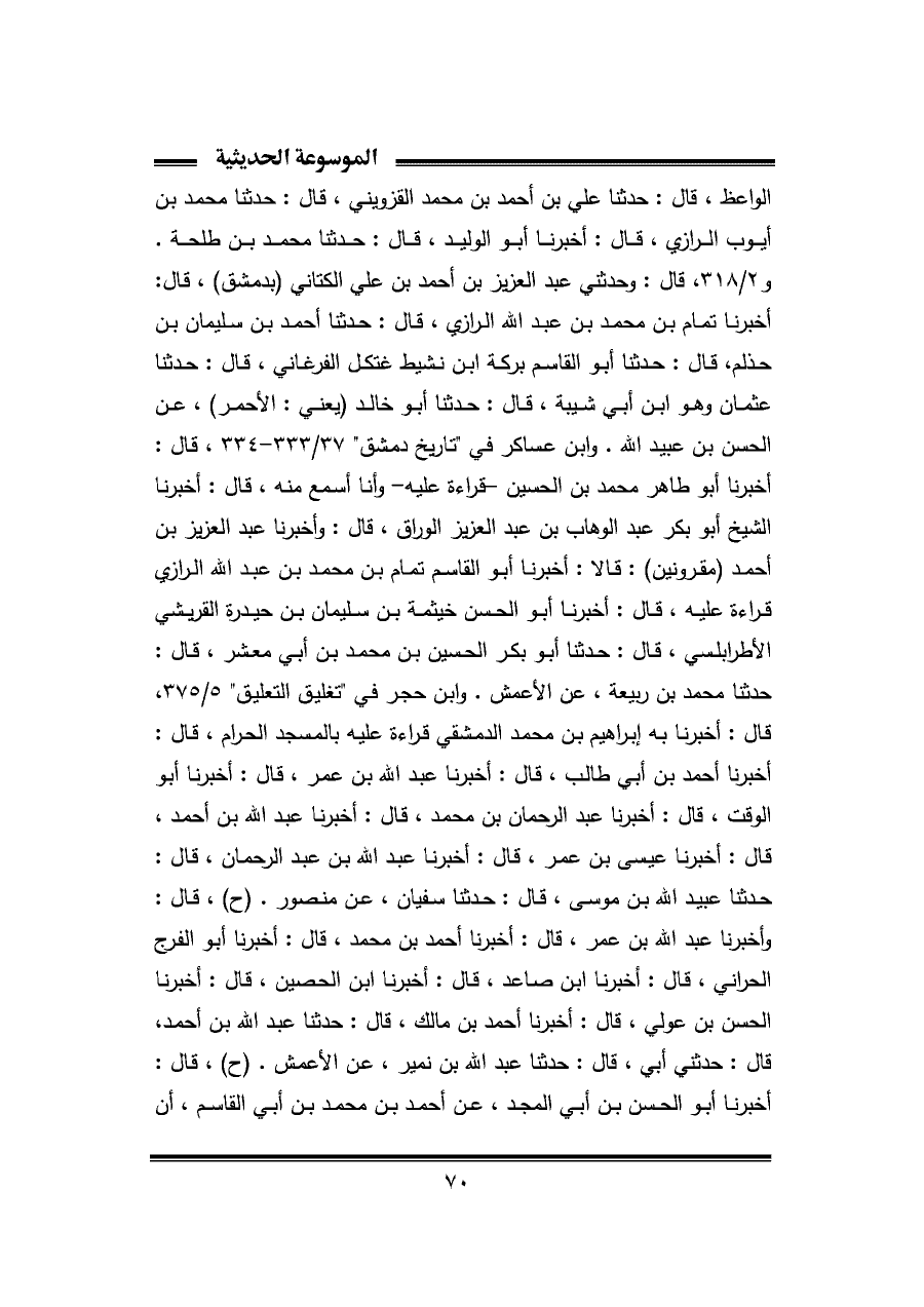 الواعظ، قال: حدثنا علي بن أحمد بن محمد القزويني، قال: حدثنا محمد بن أيوب الرازي، قال: أخبرنا أبو الوليد، قال: حدثنا محمد بن طلحة. و ٢/ ٣١٨، قال: وحدثني عبد العزيز بن أحمد بن علي الكتاني (بدمشق)، قال: أخبرنا تمام بن محمد بن عبد الله الرازي، قال: حدثنا أحمد بن سليمان بن حذلم، قال: حدثنا أبو القاسم بركة ابن نشيط غتكل الفرغاني، قال: حدثنا عثمان وهو ابن أبي شيبة، قال: حدثنا أبو خالد (يعني: الأحمر)، عن الحسن بن عبيد الله. وابن عساكر في "تاريخ دمشق" ٣٧/ ٣٣٣ - ٣٣٤، قال: أخبرنا أبو طاهر محمد بن الحسين - قراءة عليه - وأنا أسمع منه، قال: أخبرنا الشيخ أبو بكر عبد الوهاب بن عبد العزيز الوراق، قال: وأخبرنا عبد العزيز بن أحمد (مقرونين): قالا: أخبرنا أبو القاسم تمام بن محمد بن عبد الله الرازي قراءة عليه، قال: أخبرنا أبو الحسن خيثمة بن سليمان بن حيدرة القريشي الأطرابلسي، قال: حدثنا أبو بكر الحسين بن محمد بن أبي معشر، قال: حدثنا محمد بن ربيعة، عن الأعمش. وابن حجر في "تغليق التعليق" ٥/ ٣٧٥، قال: أخبرنا به إبراهيم بن محمد الدمشقي قراءة عليه بالمسجد الحرام، قال: أخبرنا أحمد بن أبي طالب، قال: أخبرنا عبد الله بن عمر، قال: أخبرنا أبو الوقت، قال: أخبرنا عبد الرحمان بن محمد، قال: أخبرنا عبد الله بن أحمد، قال: أخبرنا عيسى بن عمر، قال: أخبرنا عبد الله بن عبد الرحمان، قال: حدثنا عبيد الله بن موسى، قال: حدثنا سفيان، عن منصور. (ح)، قال: وأخبرنا عبد الله بن عمر، قال: أخبرنا أحمد بن محمد، قال: أخبرنا أبو الفرج الحراني، قال: أخبرنا ابن صاعد، قال: أخبرنا ابن الحصين، قال: أخبرنا الحسن بن عولي، قال: أخبرنا أحمد بن مالك، قال: حدثنا عبد الله بن أحمد، قال: حدثني أبي، قال: حدثنا عبد الله بن نمير، عن الأعمش. (ح)، قال: أخبرنا أبو الحسن بن أبي المجد، عن أحمد بن محمد بن أبي القاسم، أن