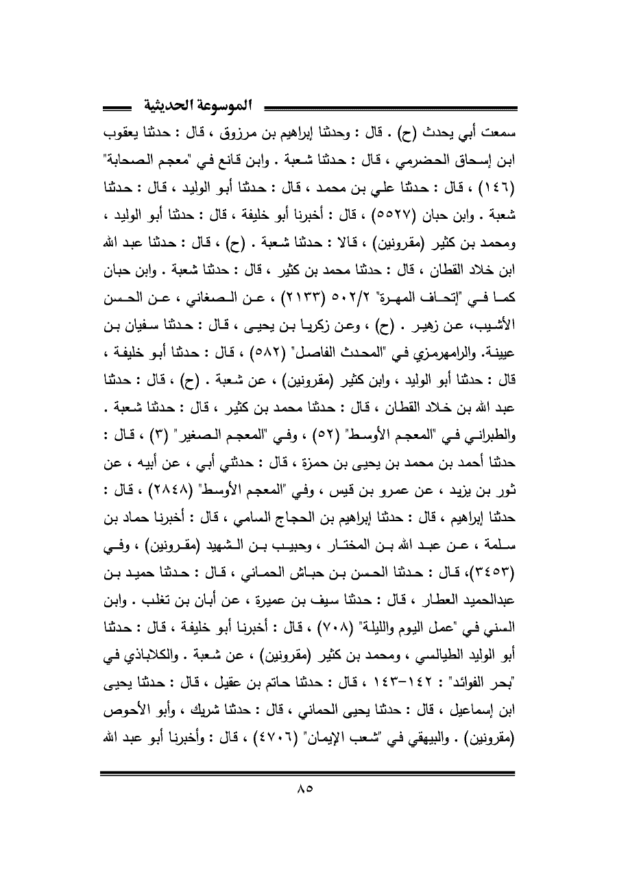 سمعت أبي يحدث (ح). قال: وحدثنا إبراهيم بن مرزوق، قال: حدثنا يعقوب بن إسحاق الحضرمي، قال: حدثنا شعبة. وابن قانع في "معجم الصحابة" (١٤٦)، قال: حدثنا علي بن محمد، قال: حدثنا أبو الوليد، قال: حدثنا شعبة. وابن حبان (٥٥٢٧)، قال: أخبرنا أبو خليفة، قال: حدثنا أبو الوليد، ومحمد بن كثير (مقرونين)، قالا: حدثنا شعبة. (ح)، قال: حدثنا عبد الله بن خلاد القطان، قال: حدثنا محمد بن كثير، قال: حدثنا شعبة. وابن حبان كما في "إتحاف المهرة" ٢/ ٥٠٢ (٢١٣٣)، عن الصغاني، عن الحسن الأشيب، عن زهير. (ح)، وعن زكريا بن يحيى، قال: حدثنا سفيان بن عيينة. والرامهرمزي في "المحدث الفاصل" (٥٨٢)، قال: حدثنا أبو خليفة، قال: حدثنا أبو الوليد، وابن كثير (مقرونين)، عن شعبة. (ح)، قال: حدثنا عبد الله بن خلاد القطان، قال: حدثنا محمد بن كثير، قال: حدثنا شعبة. والطبراني في "المعجم الأوسط" (٥٢)، وفي "المعجم الصغير" (٣)، قال: حدثنا أحمد بن محمد بن يحيى بن حمزة، قال: حدثني أبي، عن أبيه، عن ثور بن يزيد، عن عمرو بن قيس، وفي "المعجم الأوسط" (٢٨٤٨)، قال: حدثنا إبراهيم، قال: حدثنا إبراهيم بن الحجاج السامي، قال: أخبرنا حماد بن سلمة، عن عبد الله بن المختار، وحبيب بن الشهيد (مقرونين)، وفي (٣٤٥٣)، قال: حدثنا الحسن بن حباش الحماني، قال: حدثنا حميد بن عبد الحميد العطار، قال: حدثنا سيف بن عميرة، عن أبان بن تغلب. وابن السني في "عمل اليوم والليلة" (٧٠٨)، قال: أخبرنا أبو خليفة، قال: حدثنا أبو الوليد الطيالسي، ومحمد بن كثير (مقرونين)، عن شعبة. والكلاباذي في "بحر الفوائد": ١٤٢ - ١٤٣، قال: حدثنا حاتم بن عقيل، قال: حدثنا يحيى بن إسماعيل، قال: حدثنا يحيى الحماني، قال: حدثنا شريك، وأبو الأحوص (مقرونين). والبيهقي في "شعب الإيمان" (٤٧٠٦)، قال: وأخبرنا أبو عبد الله